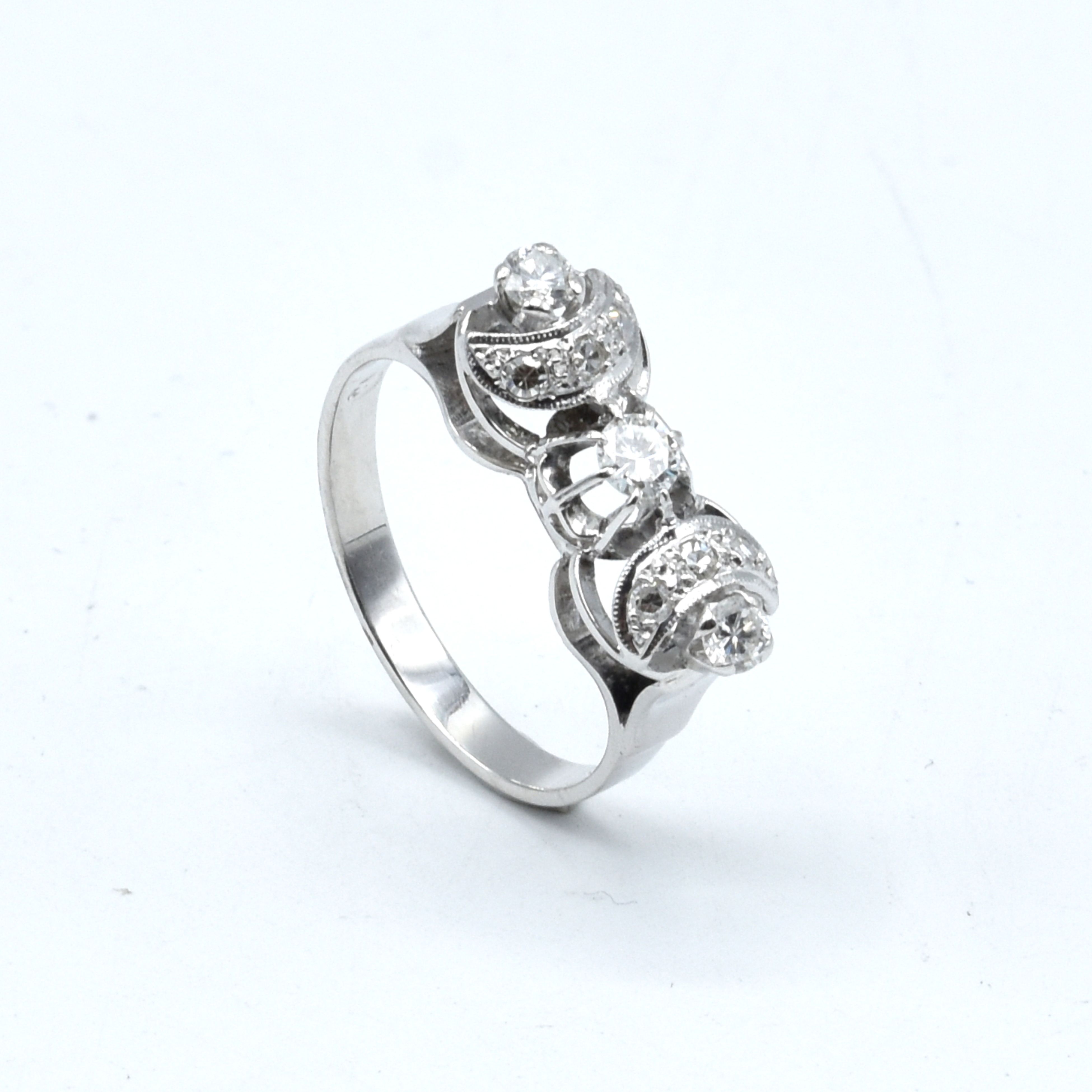 Bague en or blanc 18 ct sertie d'1 brillant +/- 0.18 ct, 2 x +/- 0.10 ct et 6 diamants taille 8/8 +/- 0.12 ct - 4.6 g (Taille: 58.5)