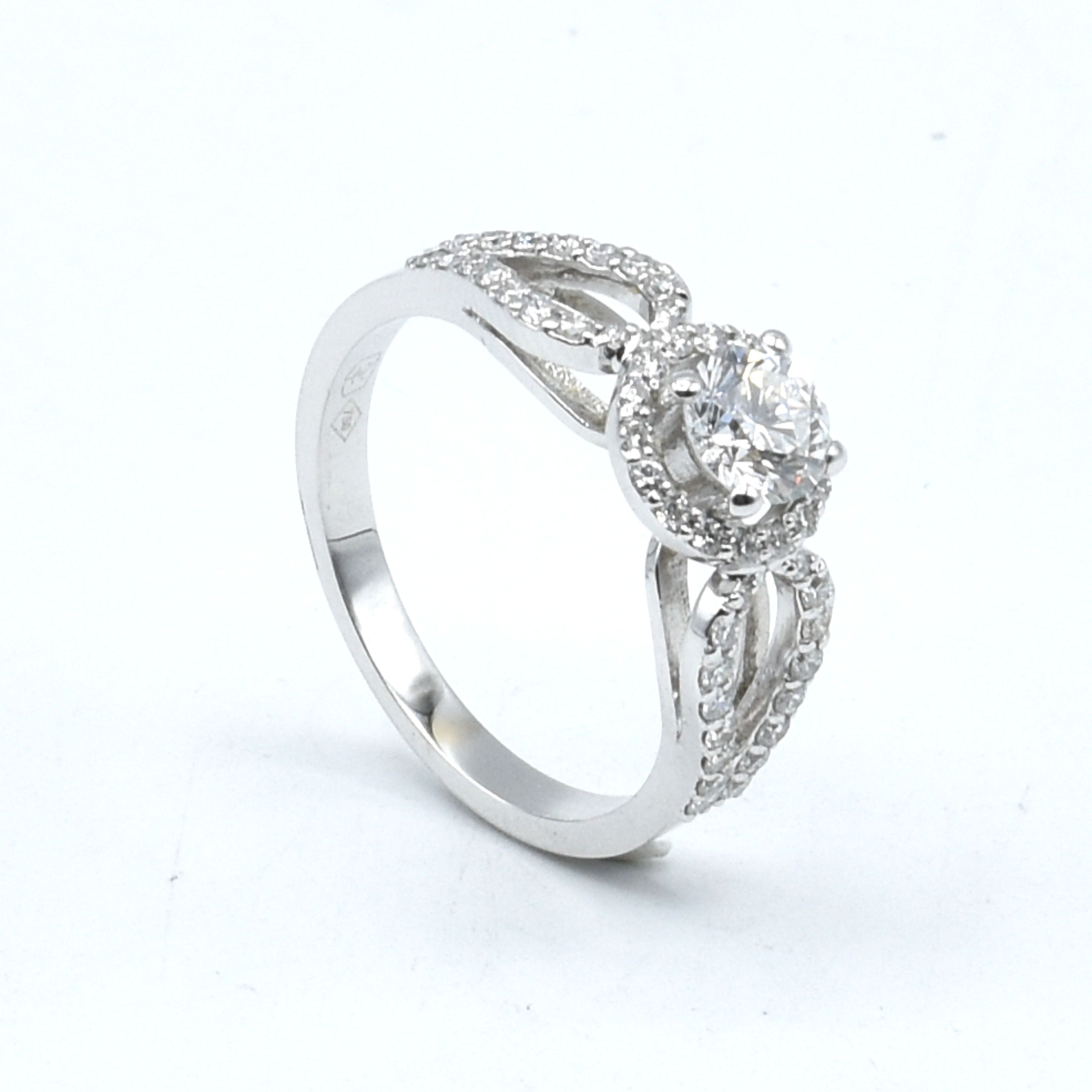 Bague en or blanc 18 ct sertie d'1 brillant +/- 0.65 ct et 48 brillants +/- 0.42 ct - 4.1 g (Taille: 54)