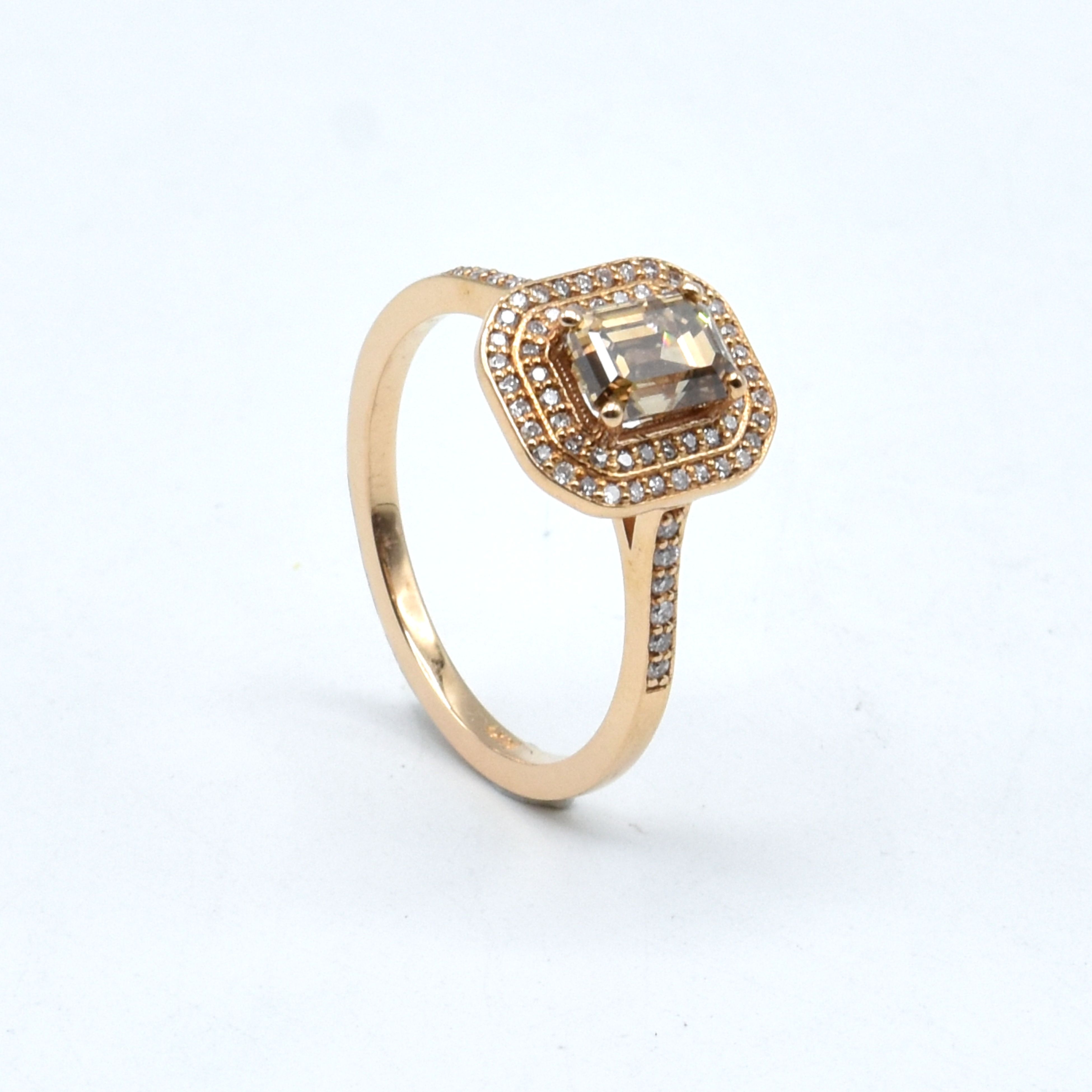 Bague en or rose 14 ct sertie de 68 brillants +/- 0.23 ct et 1 diamant fancy color taille émeraude +/- 1.03 ct - 3 g (Taille: 53.5) + certificat AIG n° J3210259426 + boîte