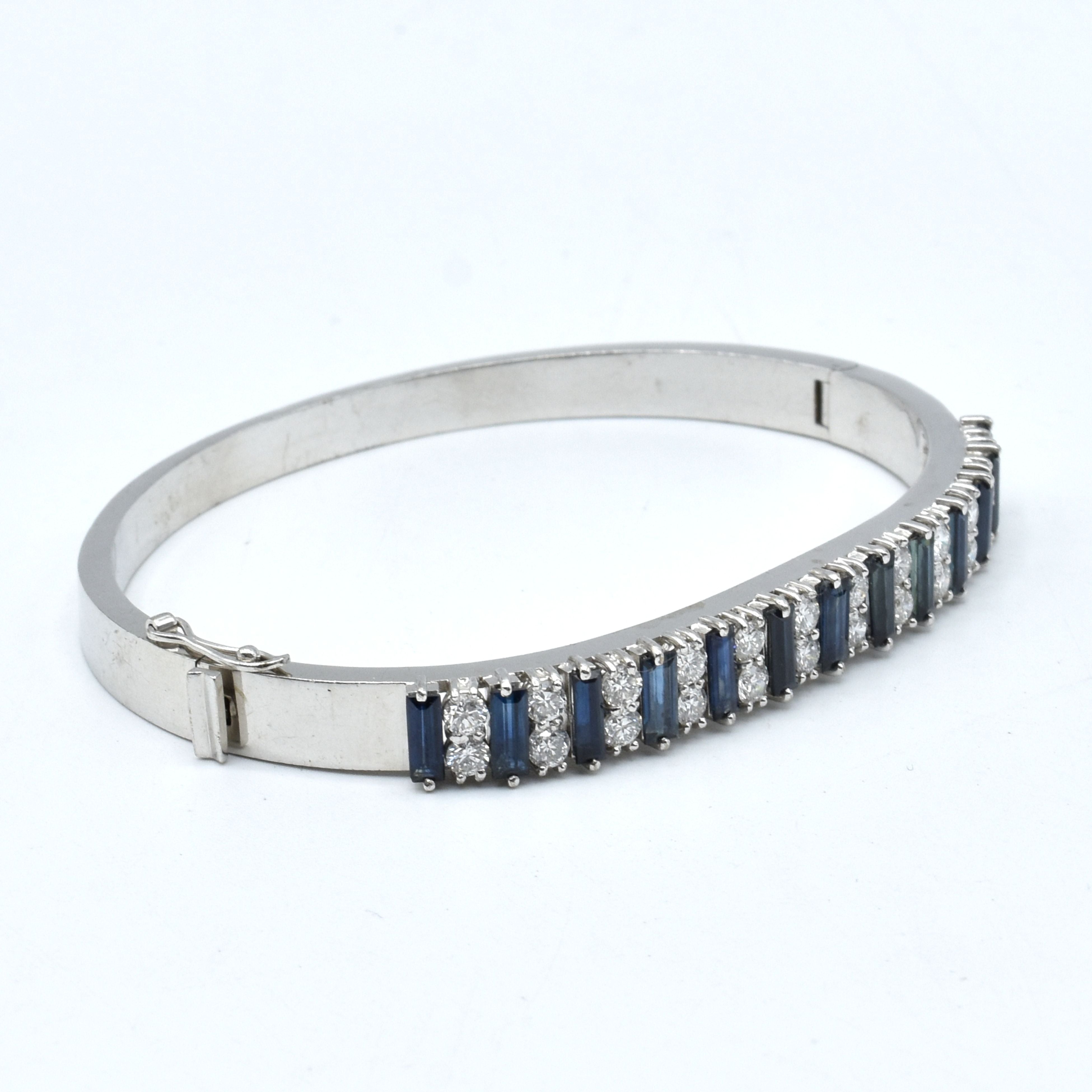 Bracelet rigide en or blanc 18 ct serti de 24 brillants +/- 2 ct et saphirs (abîmé) - 29.8 g (Diam: 6.2 x 4.7 cm)