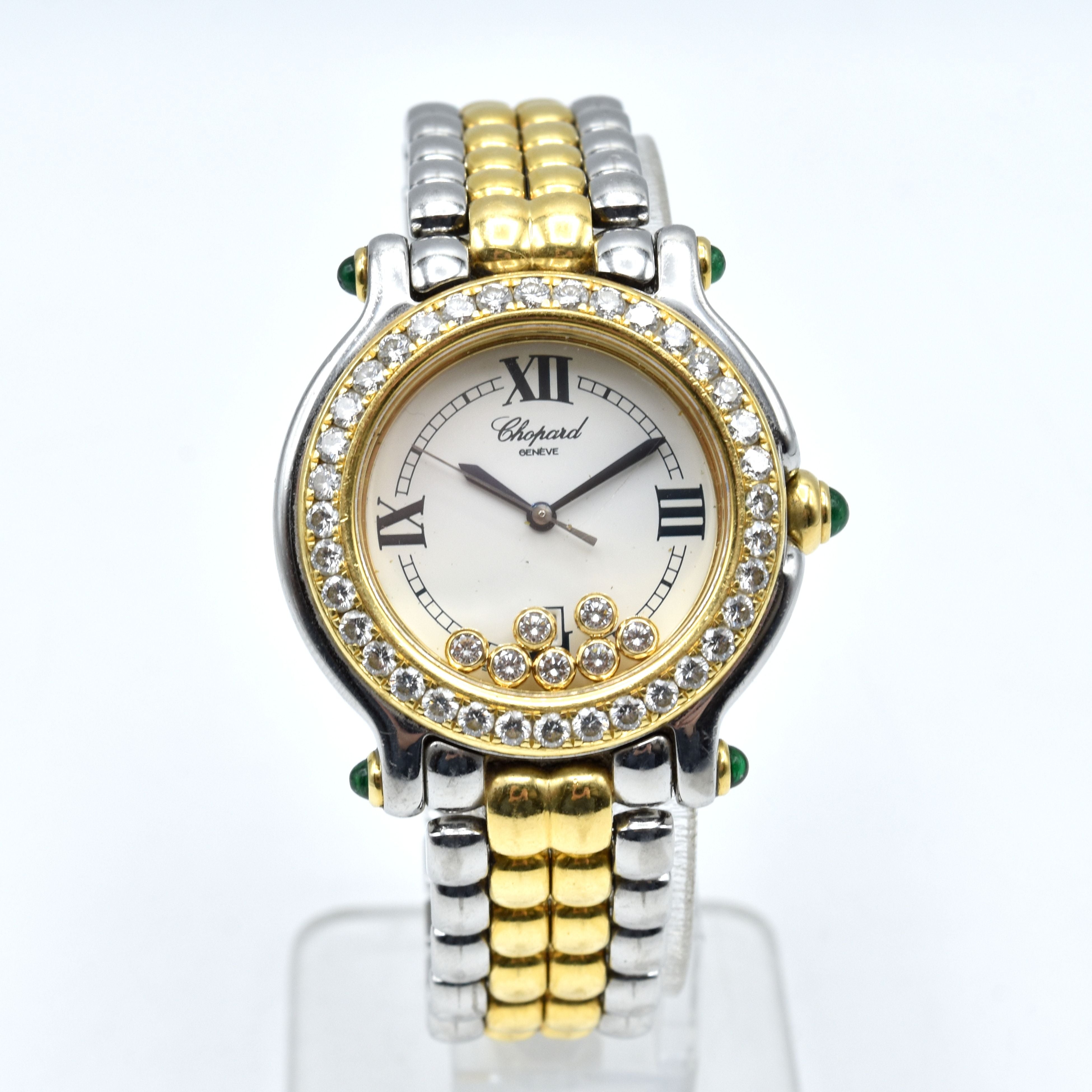 Bracelet-montre dame en acier et or jaune CHOPARD Happy Sport quartz serti de 43 brillants +/- 2.25 ct (pierres de couleur, montre n° 27 8237-22/11 985775 8236, déréglée, griffé, bosselé) (+/- 18 cm)