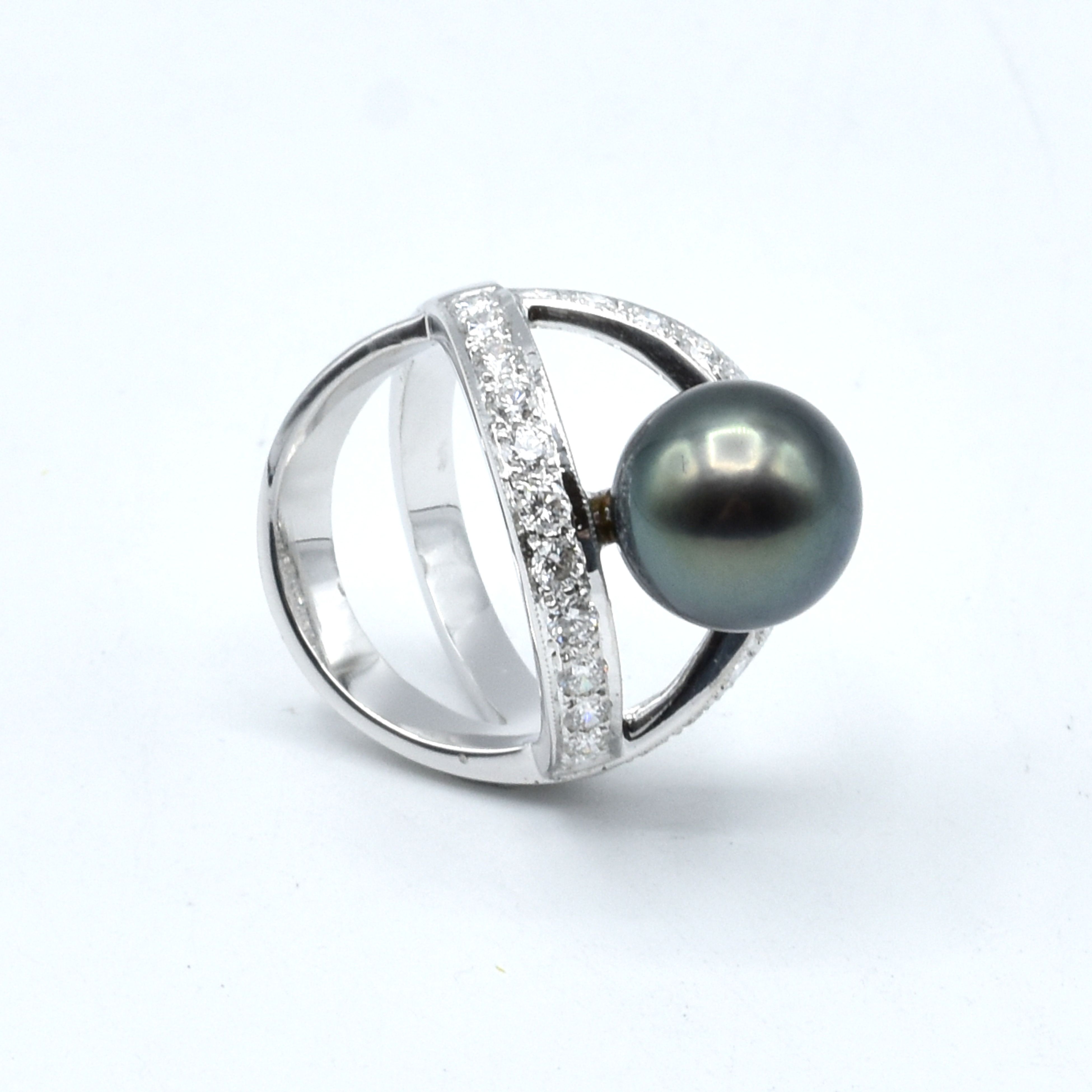 Bague en or blanc 18 ct sertie de 24 brillants +/- 1.20 ct et 1 perle de Tahiti - 9.8 g brut (Taille: 56)