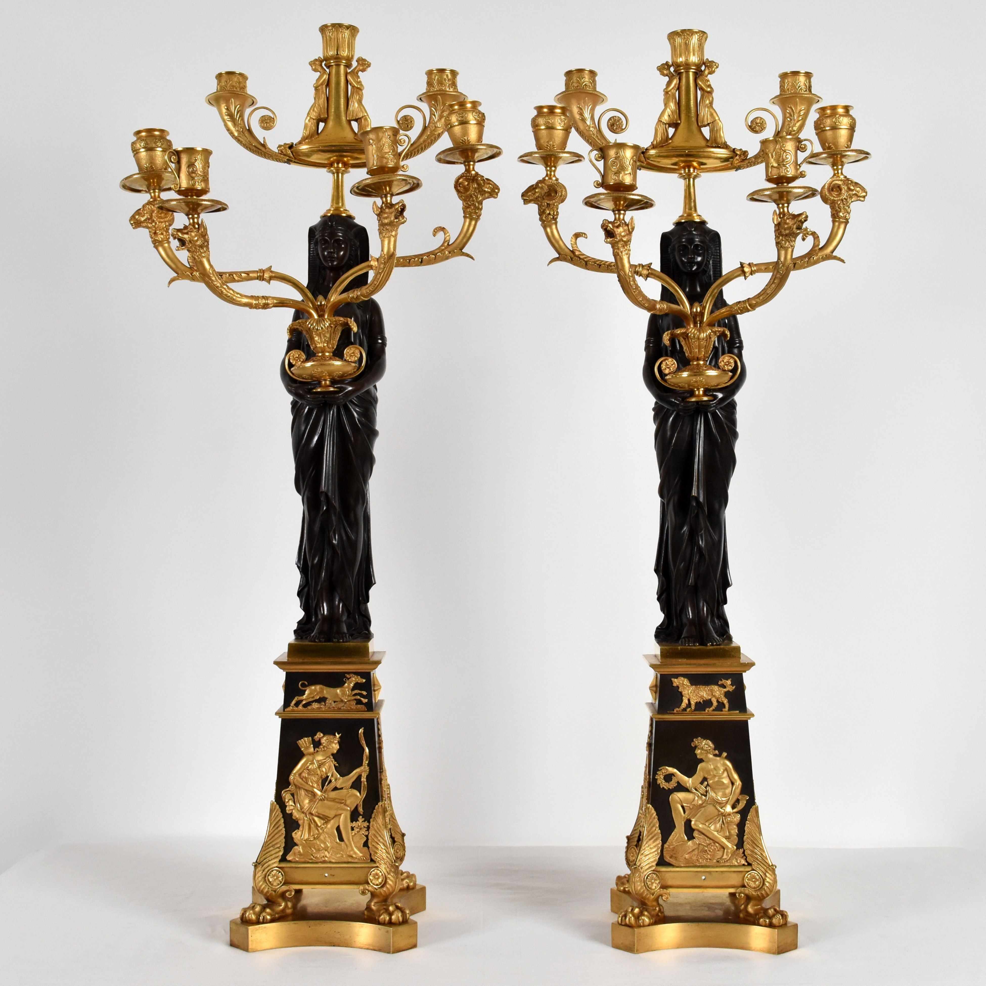 Paire de candélabres égyptiens de style Empire en bronze patiné et doré (1 ornement manque sur chaque pied) (17 x 17 x 81 cm)