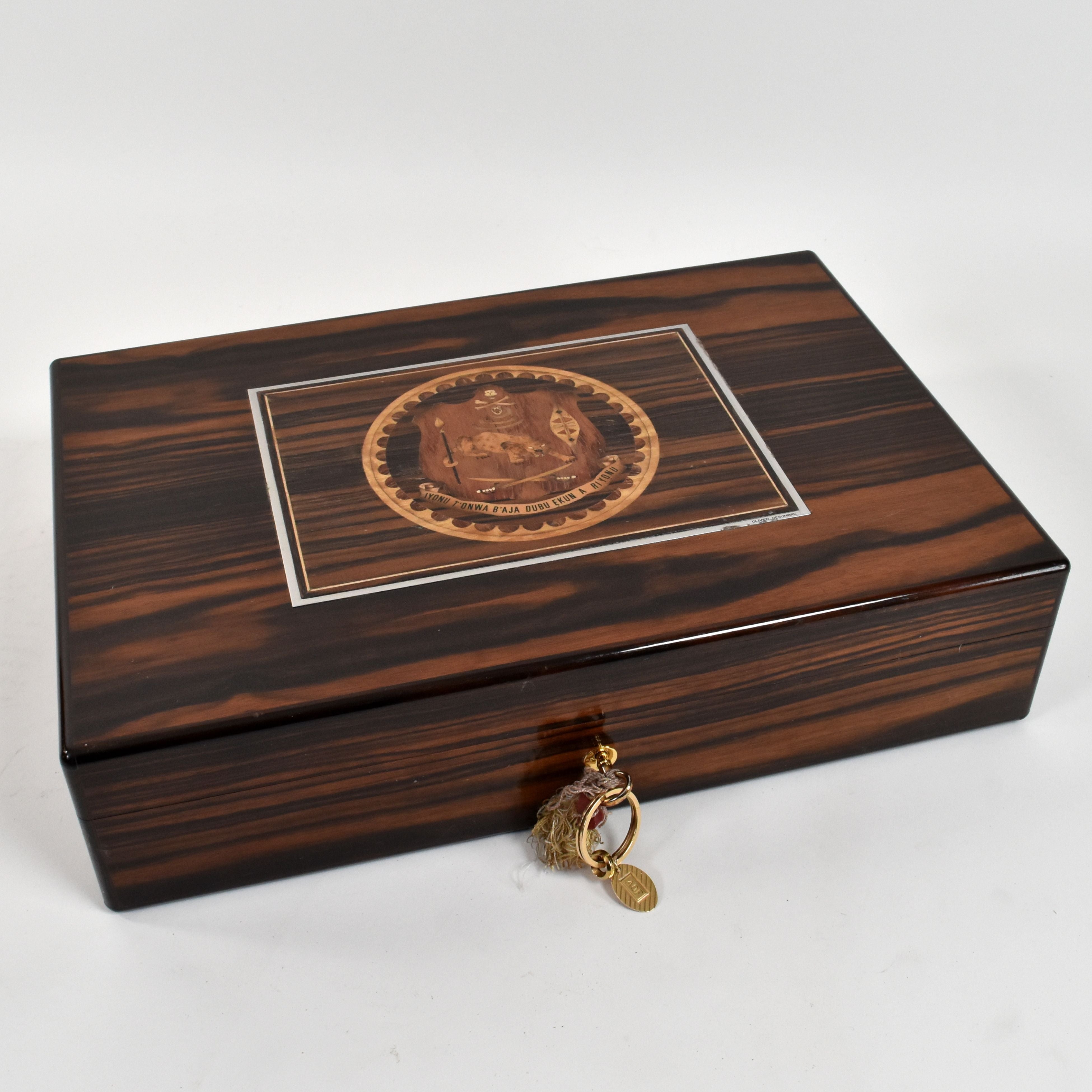 Boîte à cigare en bois décorée d'une marqueterie signée Olivier DESOMBRE selon un dessin de BOUCHERON et ayant appartenu à Antonio Oladiende Fernandez (légèrement abîmé, vernis griffé) + porte-clés en or jaune 14 ct - 10.3 g + 2 clés en métal
