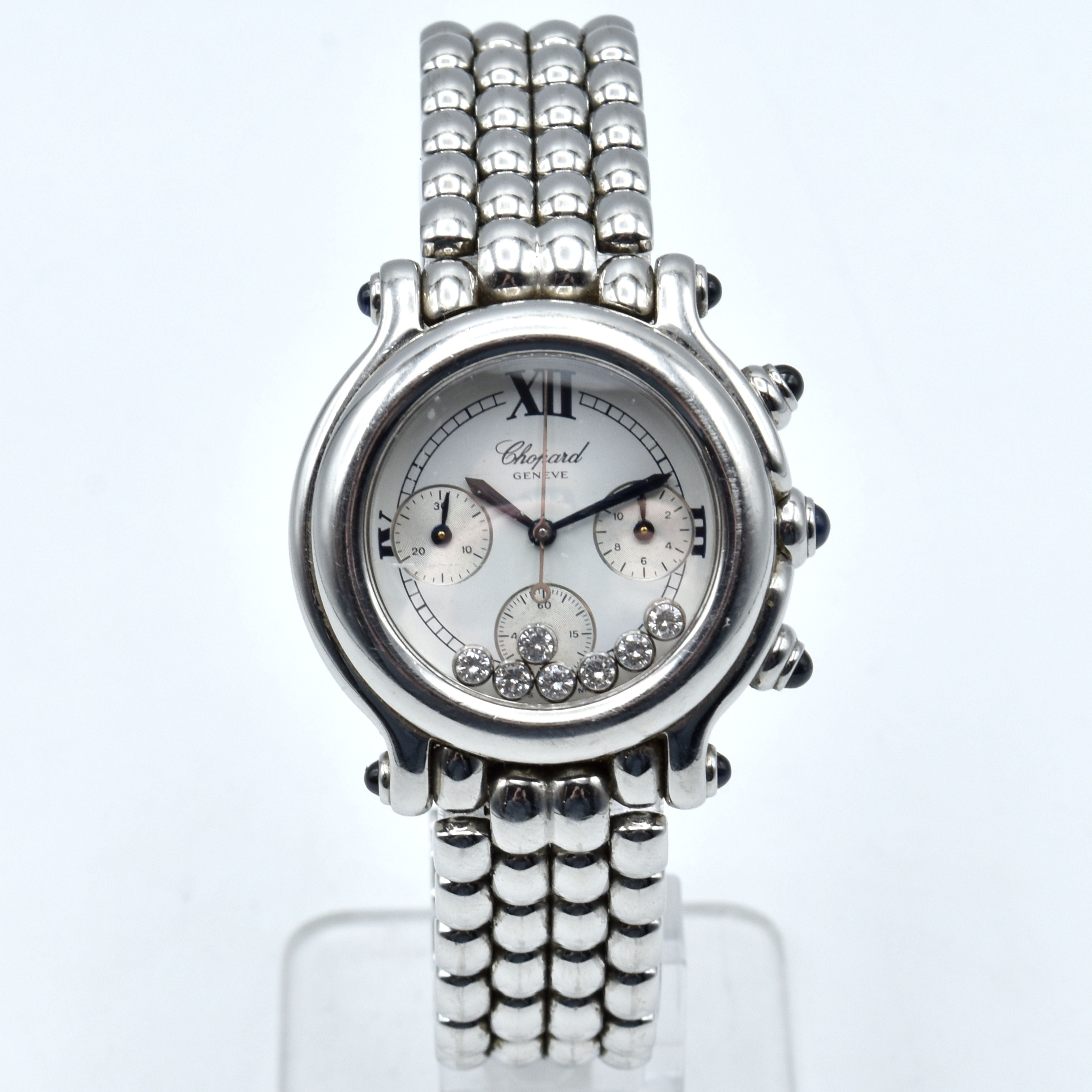 Bracelet-montre dame en acier CHOPARD Happy Sport sertie de 7 brillants +/- 0.35 ct quartz (pierres de couleur, montre n° 27/8324-23 667393 8323, verre griffé) (16 cm)