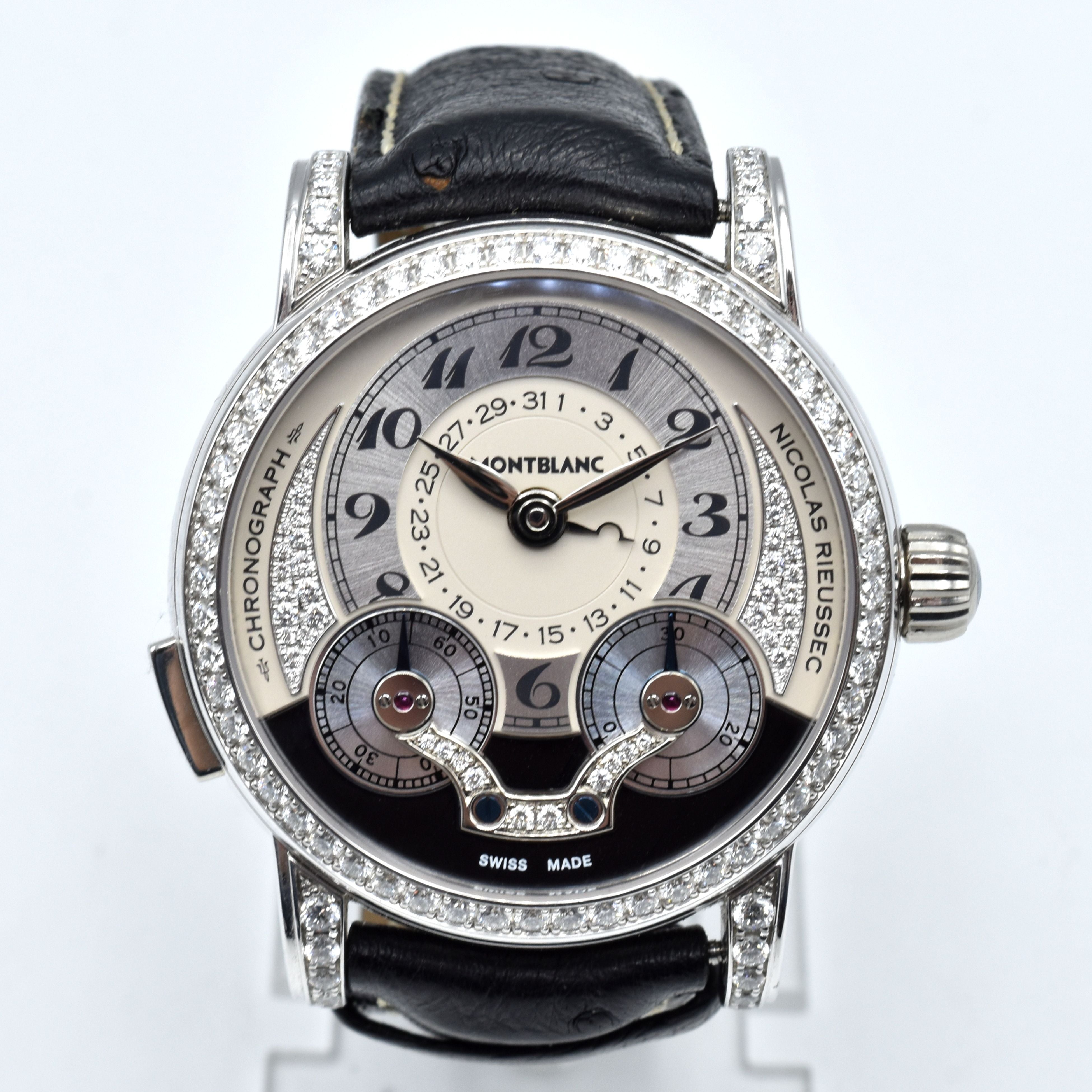 Bracelet-montre dame en or blanc 18 ct MONTBLANC Chronograph Nicolas Rieussec Le Locle automatique serti de +/- 120 brillants +/- 3 ct (bracelet en cuir d'autruche avec boucle déployante en or blanc 18 ct, édition limitée 01/01, montre n° PB241923 7135) + boîte d'origine