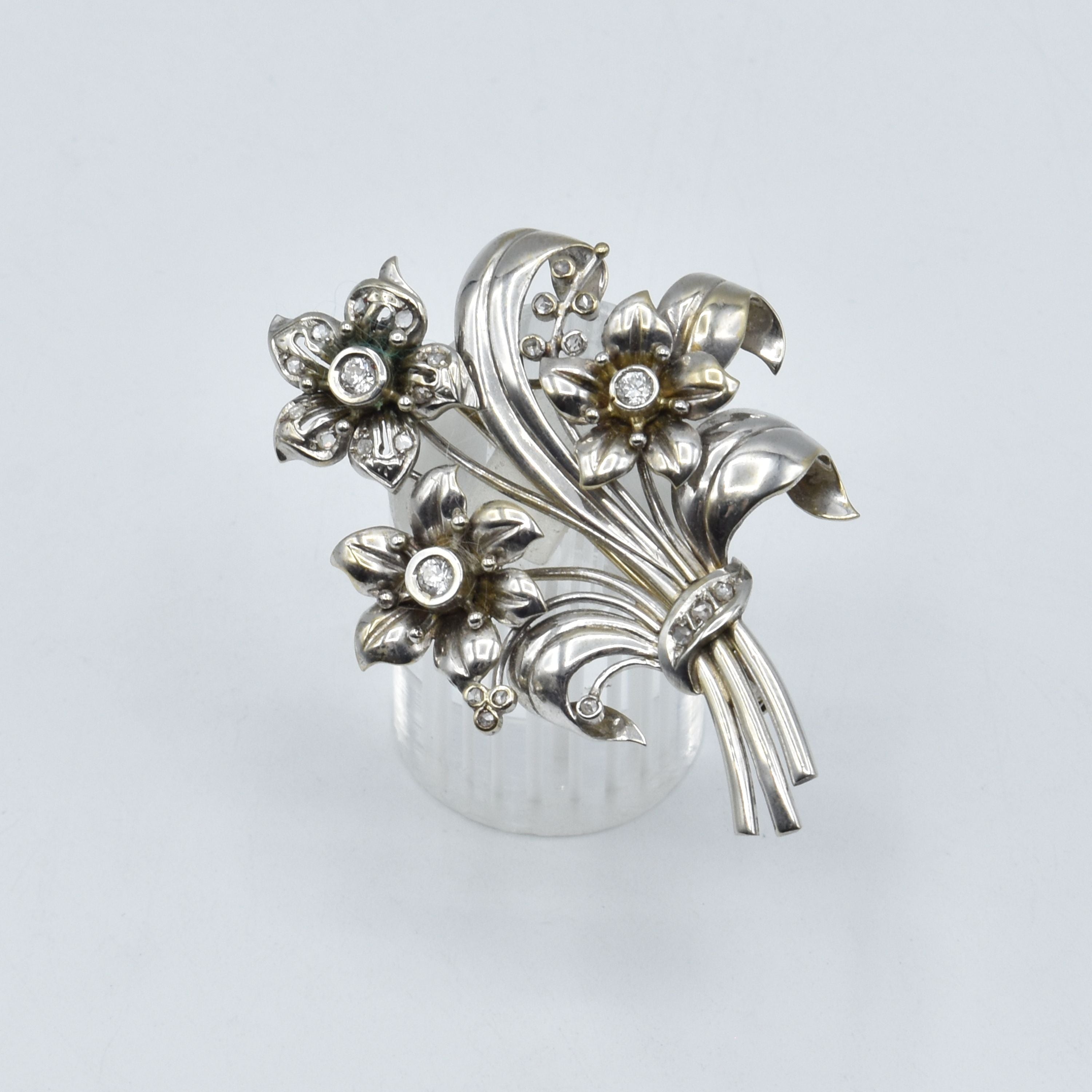 Broche en or blanc 18 ct sertie de 3 brillants +/- 0.24 ct et roses de diamants - 17 g