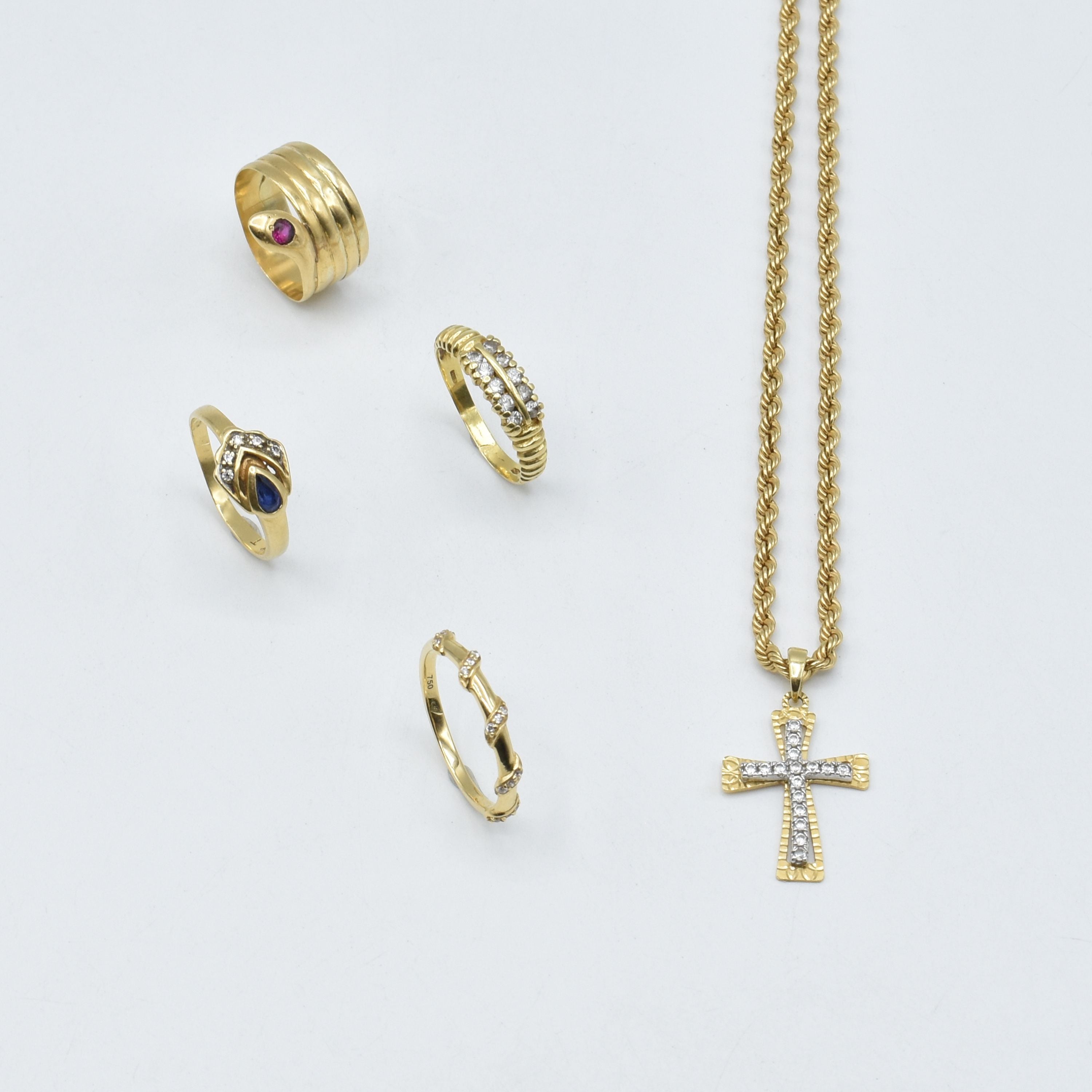 4 bagues, collier et croix en or jaune et blanc 18 ct (pierres fausses, pierres de couleur, abîmées, bosselées) - 16.5 g brut (Tailles: 49, 2 x 54 & 56) (46.5 cm)