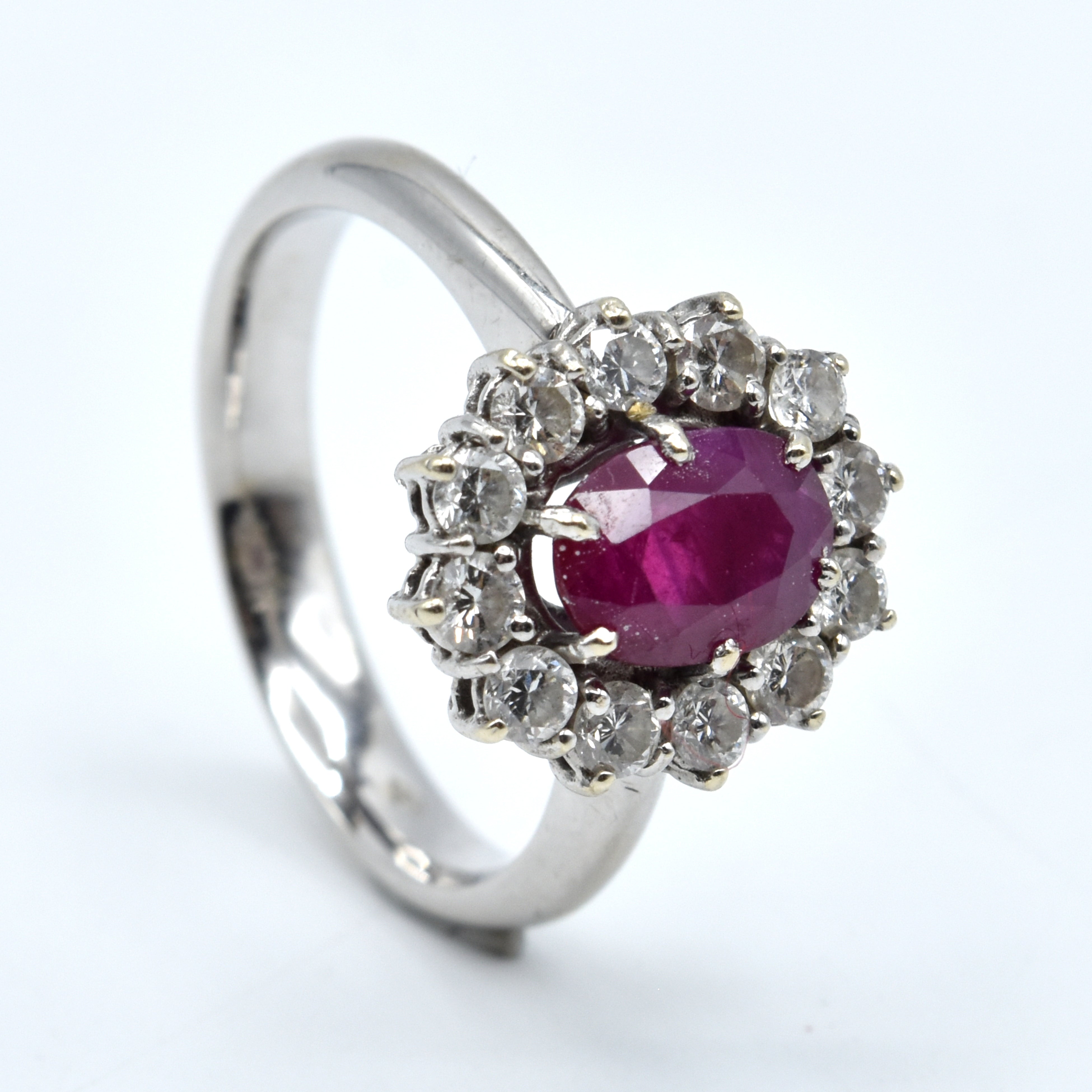 Bague en or blanc 18 ct sertie de 12 brillants +/- 0.85 ct et 1 rubis synthétique - 6.9 g brut (Taille: 59.5)