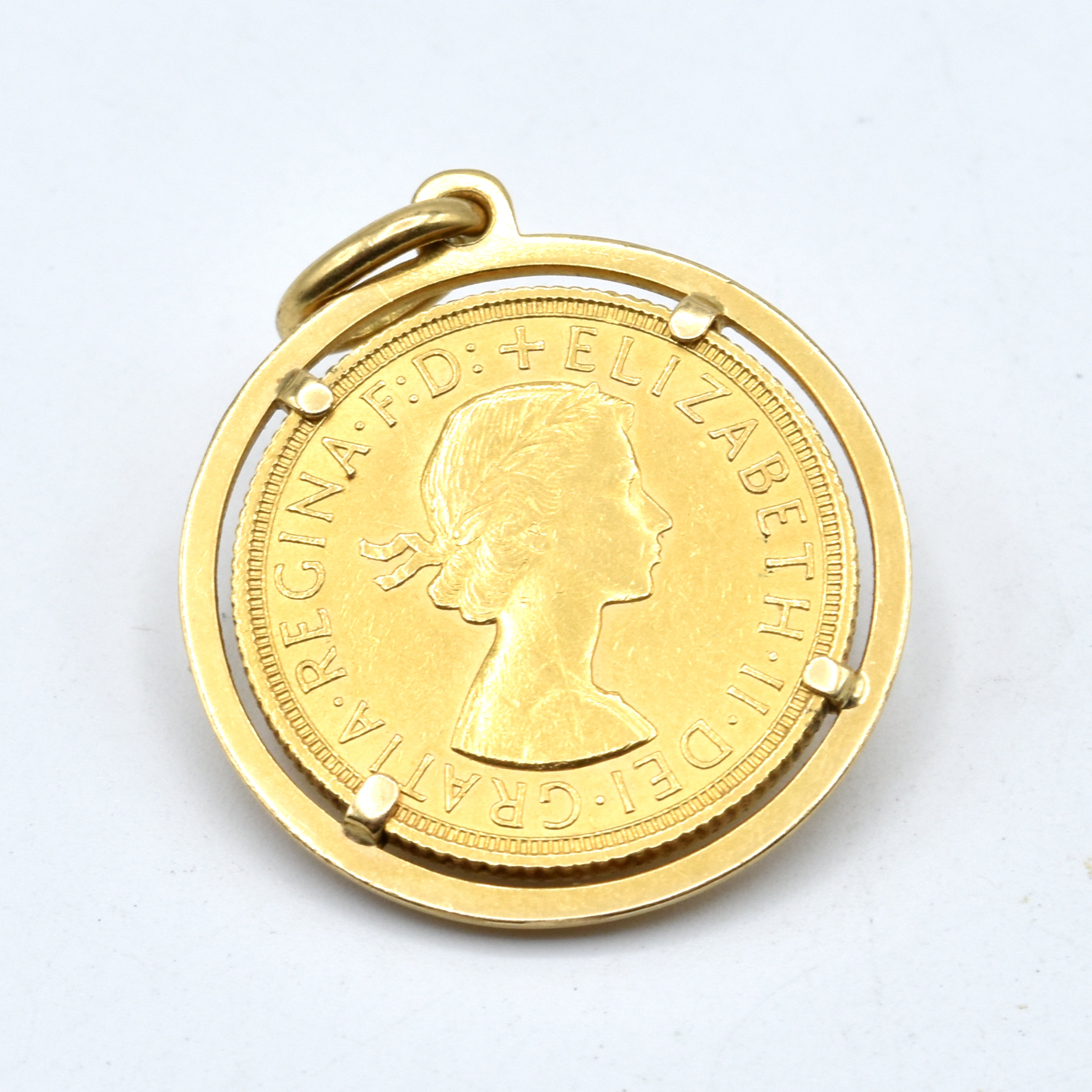 Pendentif en or jaune 18 ct serti d'1 pièce de monnaie en or jaune 916/1000 (anglaise-Elizabeth II-1 souverain-1958) - 9.9 g brut