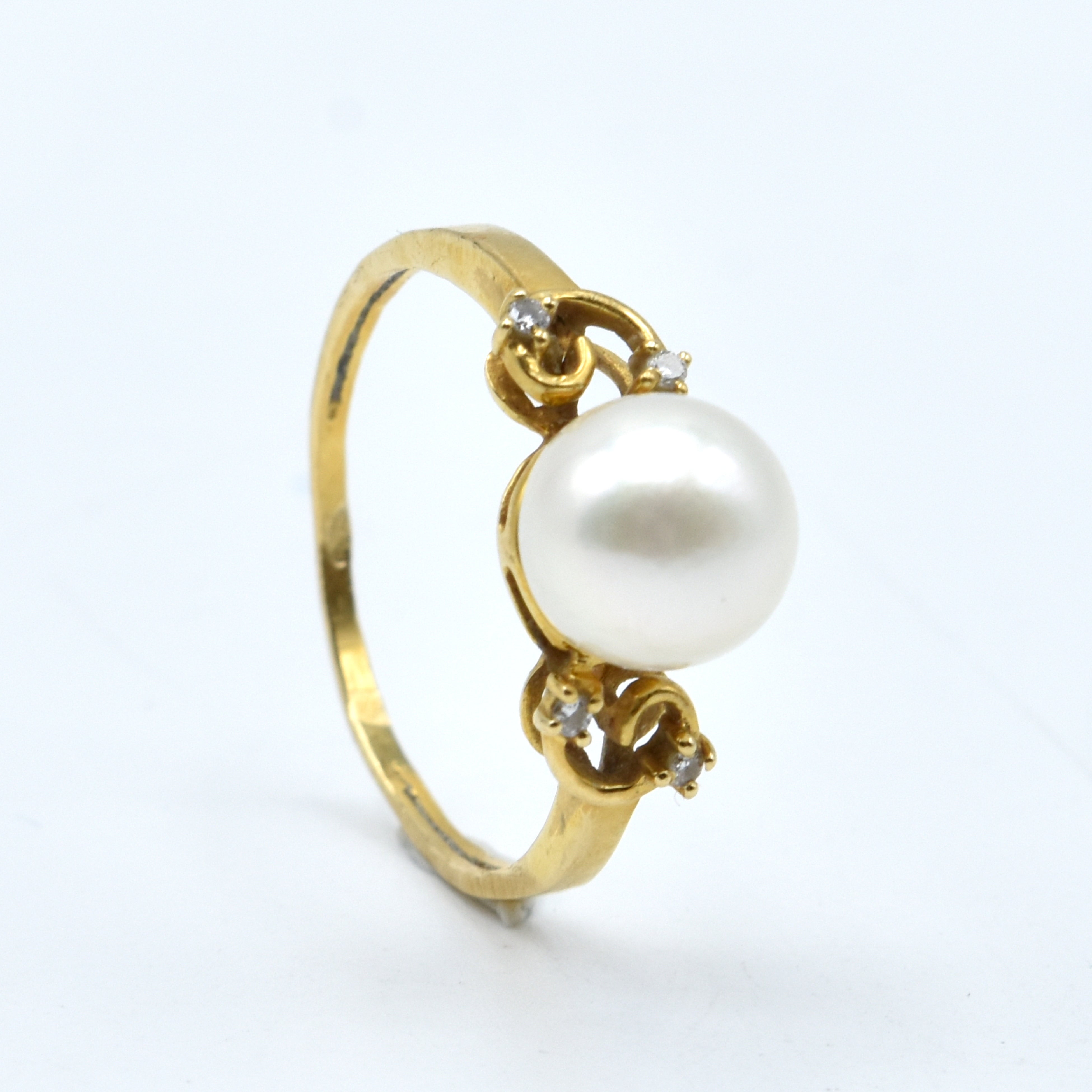 Bague en or jaune 18 ct sertie de 4 brillants +/- 0.04 ct et 1 perle (bosselée) - 2.4 g brut (Taille: 59)
