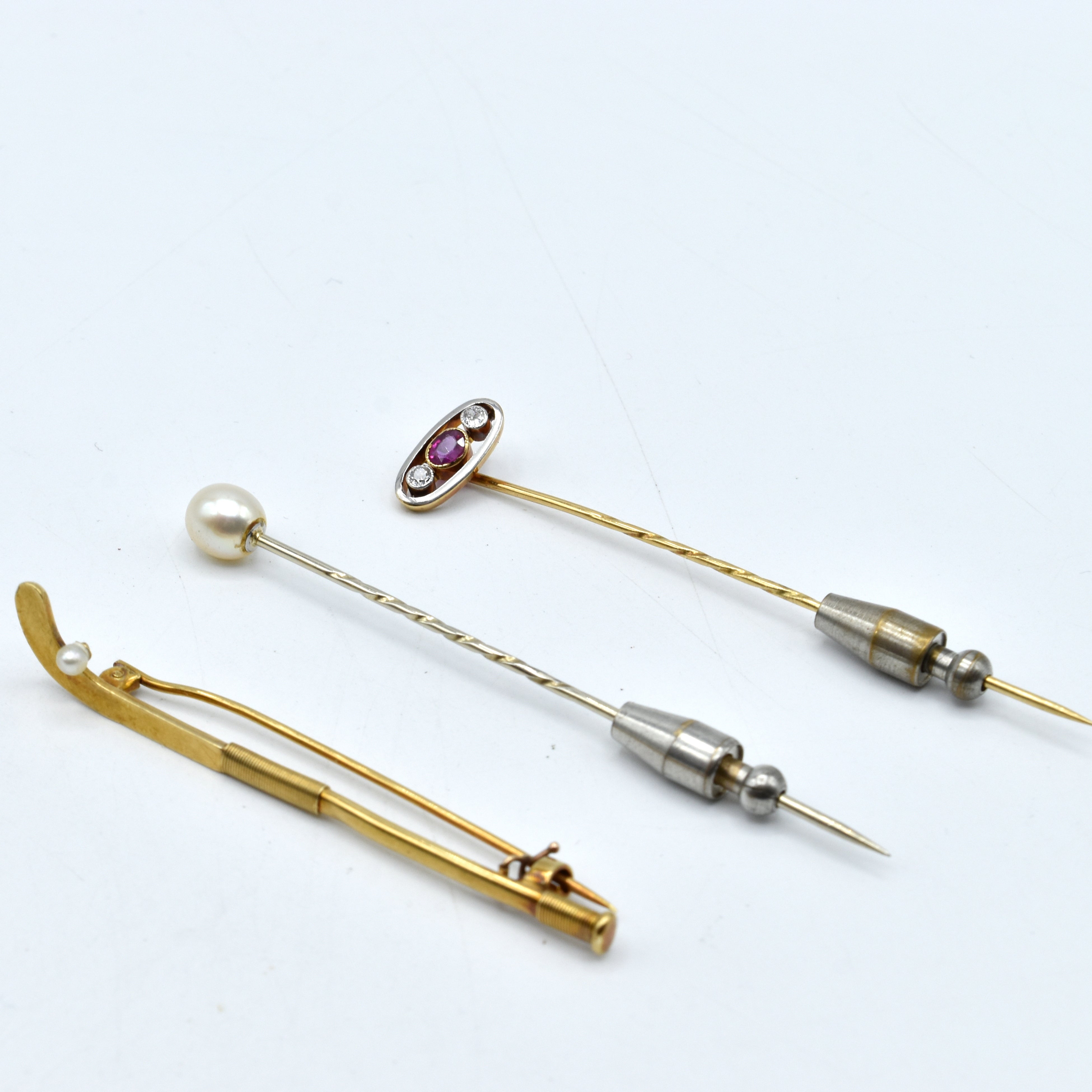 3 épingles en or jaune et blanc 18 ct sertie de 2 diamants taille ancienne +/- 0.10 ct (perles, pierre de couleur, 2 fermoirs en métal, abîmées, bosselées) - 8.6 g brut