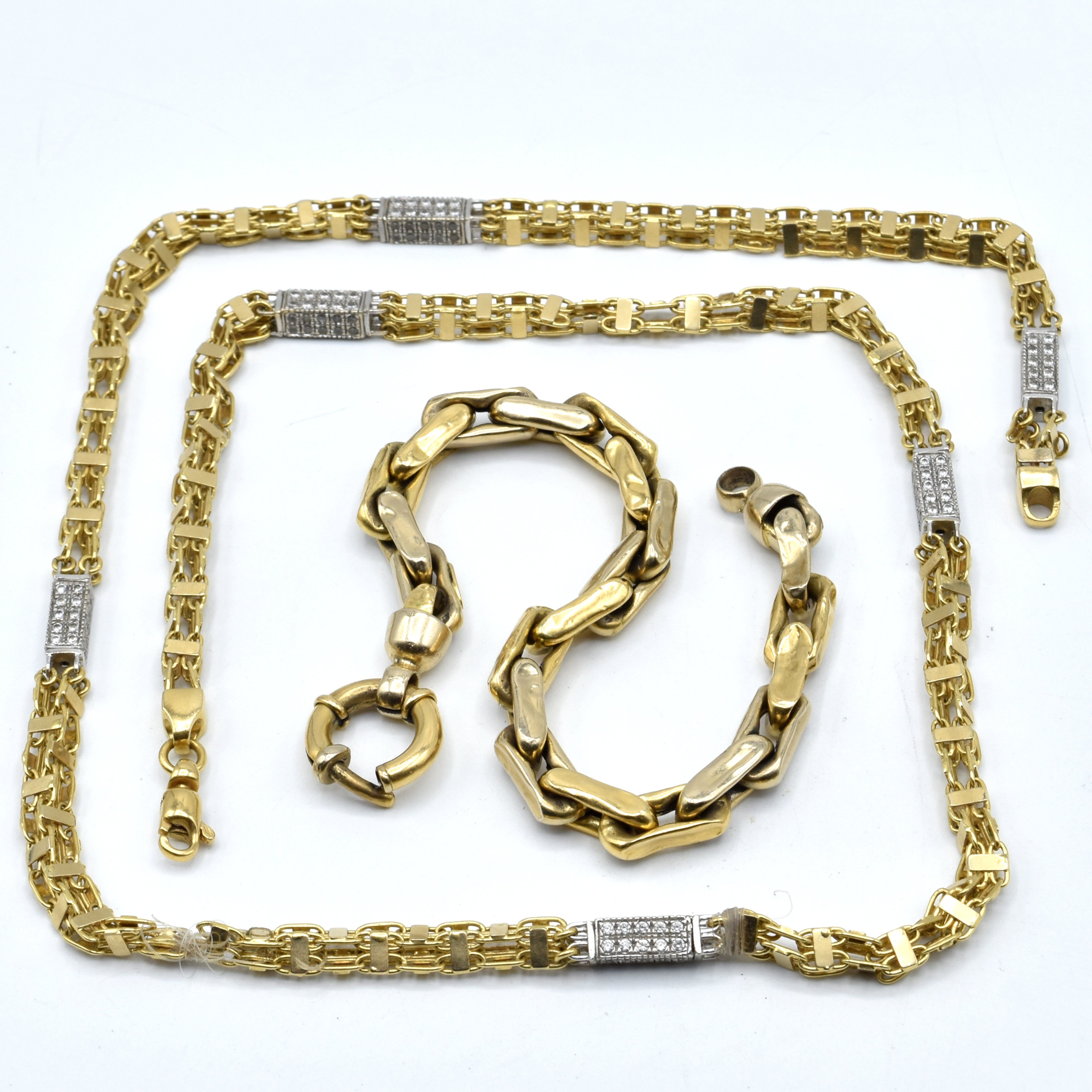 Collier et bracelet en or jaune et blanc 18 ct (pierres fausses, morceaux manquent, abîmés, bosselés, cassés) - 66.8 g brut (67 & 23 cm)