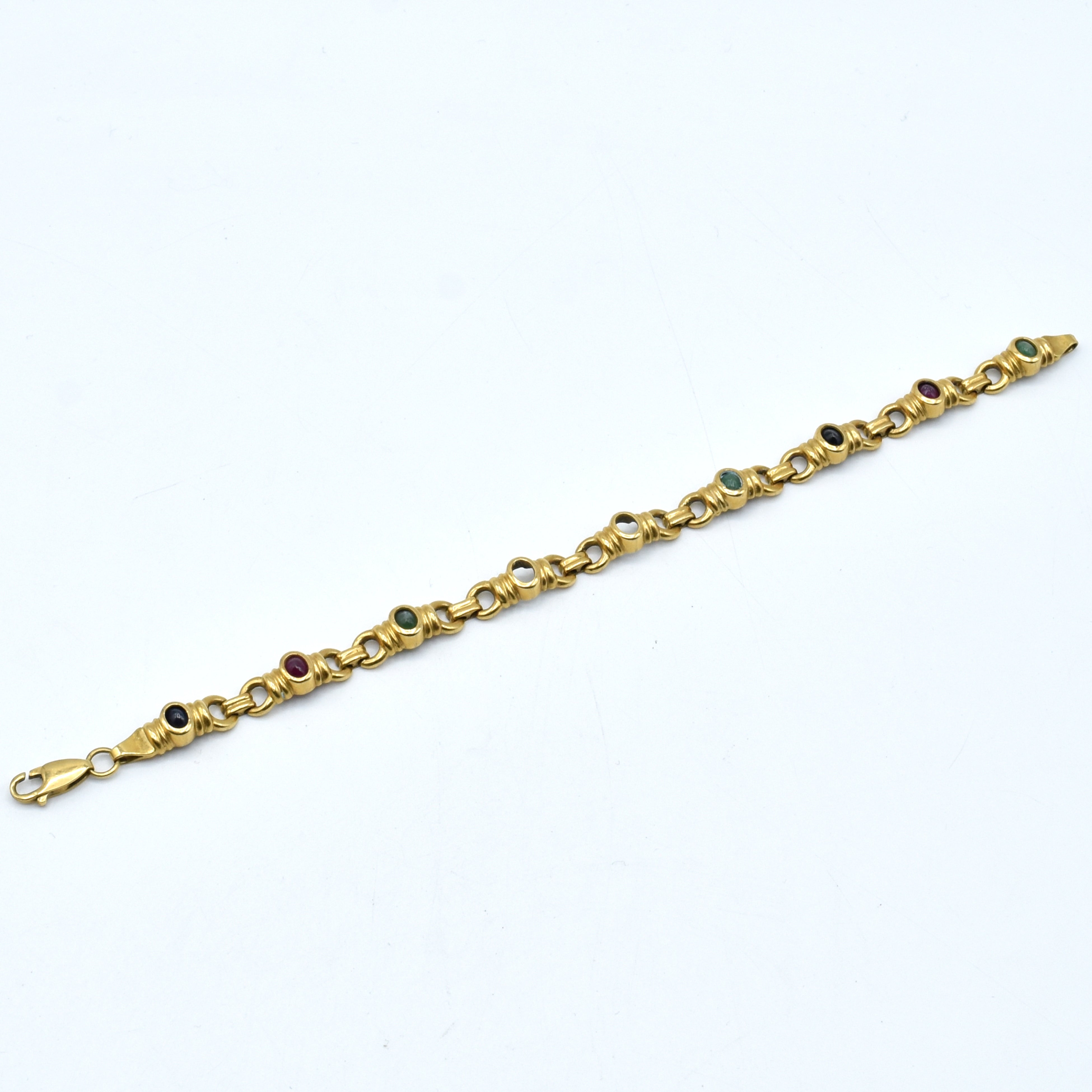 Bracelet en or jaune 18 ct serti de 2 saphirs, 2 rubis et 3 émeraudes (pierres manquent, pierres abîmées, abîmé, bosselé) - 23.7 g brut (21 cm)