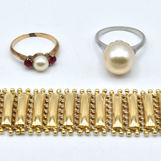 Bague et bracelet en or jaune 18 ct (perle, pierres de couleur, abîmés, bosselé) - 37 g brut (Taille: 48) (19 cm) Bague en platine sertie d'1 perle (abîmée) - 5.7 g brut (Taille: 52.5)