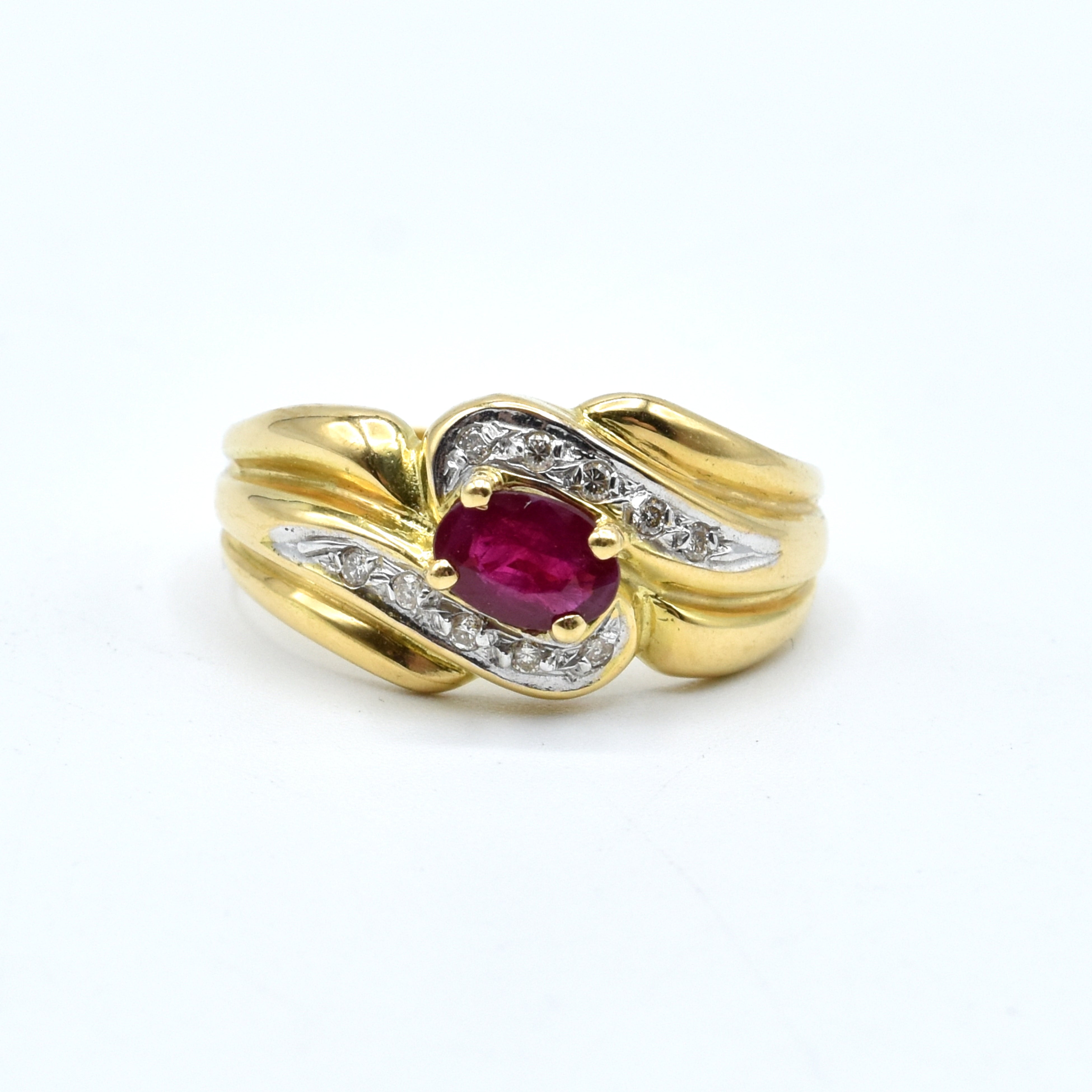 Bague en or jaune et blanc 18 ct sertie de 10 brillants +/- 0.10 ct et 1 rubis - 5.1 g brut (Taille: 56)