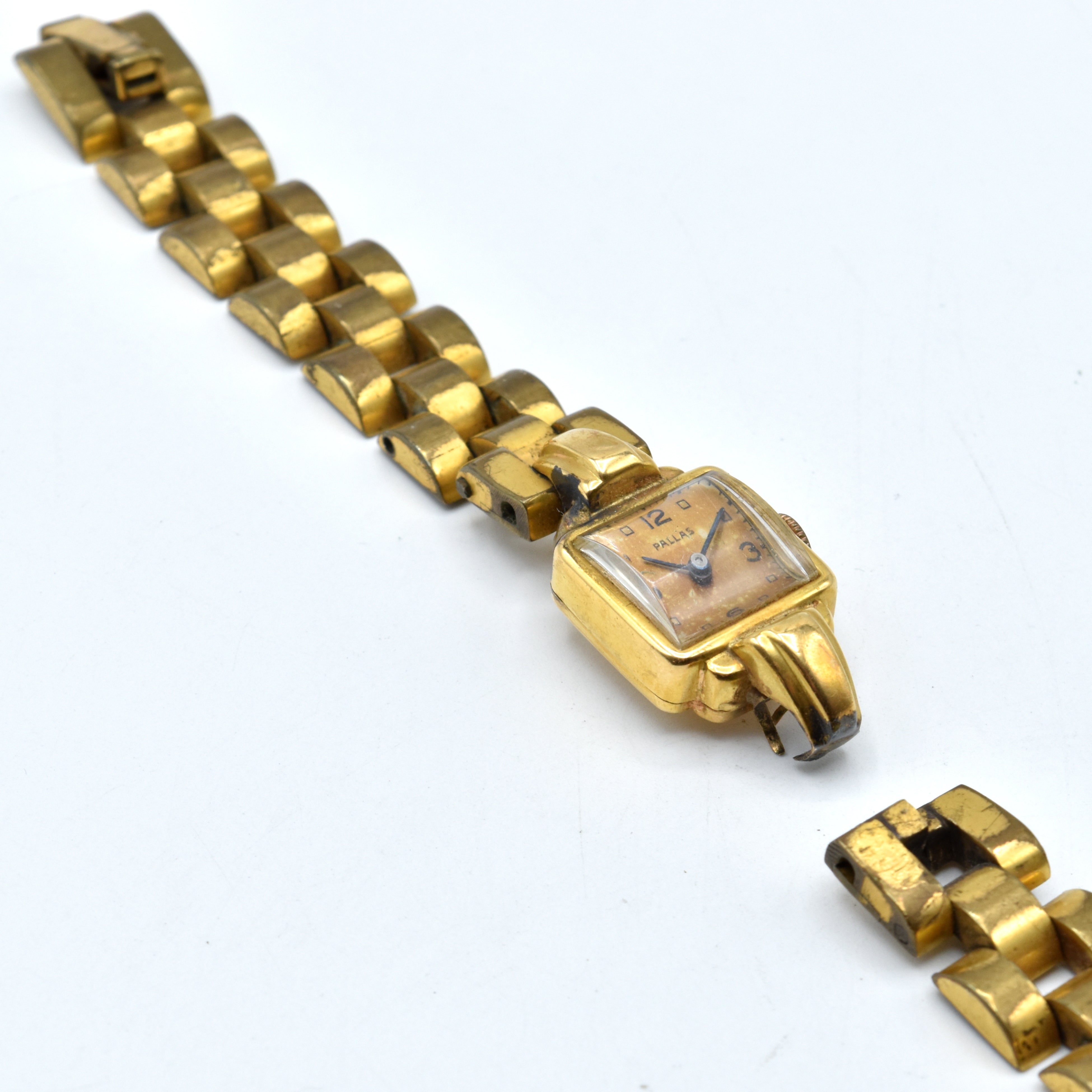 Bracelet-montre dame en or jaune 18 ct PALLAS mécanique (bracelet en plaqué or fort abîmé, morceau détaché, cadran abîmé, verre griffé, abîmé, bosselé, cassé) - 51.2 g brut (17.5 cm)