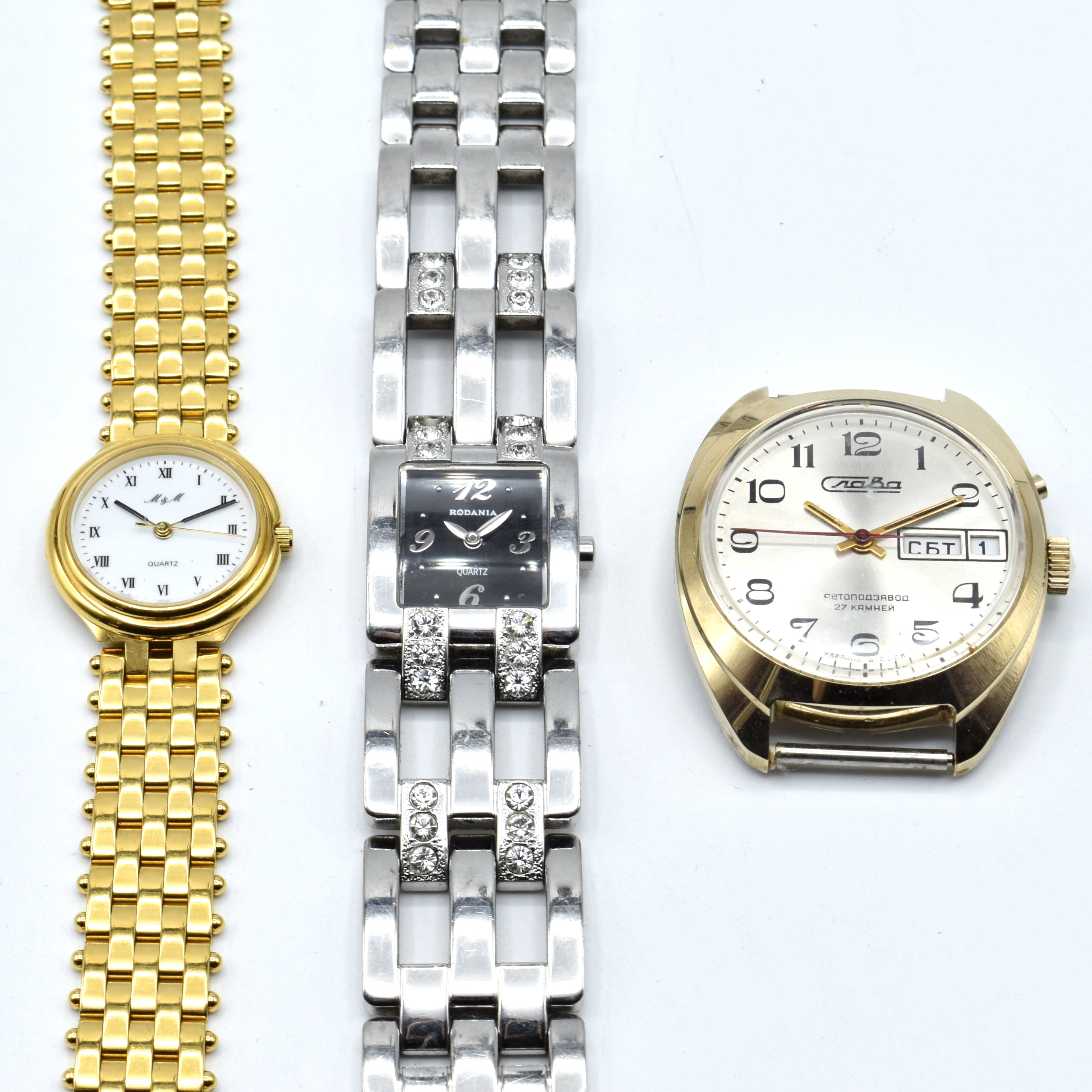 Bracelet-montre dame en acier RODANIA quartz (montre n° 24067, pierres fausses, déréglée, abîmé, bosselé, griffé) (17 cm) Bracelet-montre dame en plaqué or M&M quartz (déréglée) (15 cm) Bracelet-montre homme en acier CRABA mécanique (bracelet manque, montre n° 336016)
