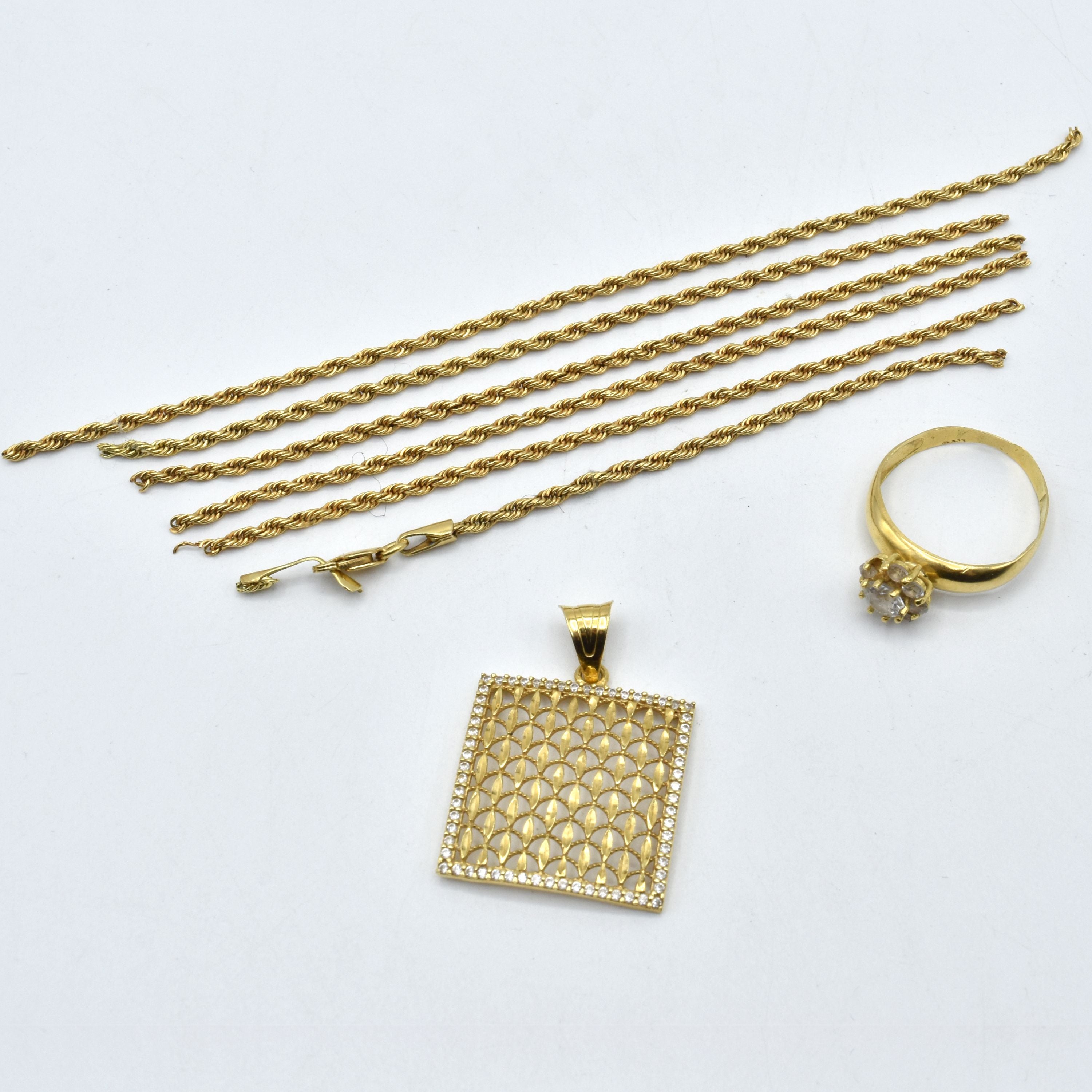 Bague, 6 morceaux de collier et pendentif en or jaune 18 ct (pierres fausses, abîmés, bosselée, cassé) - 9.3 g brut (Taille: 57)