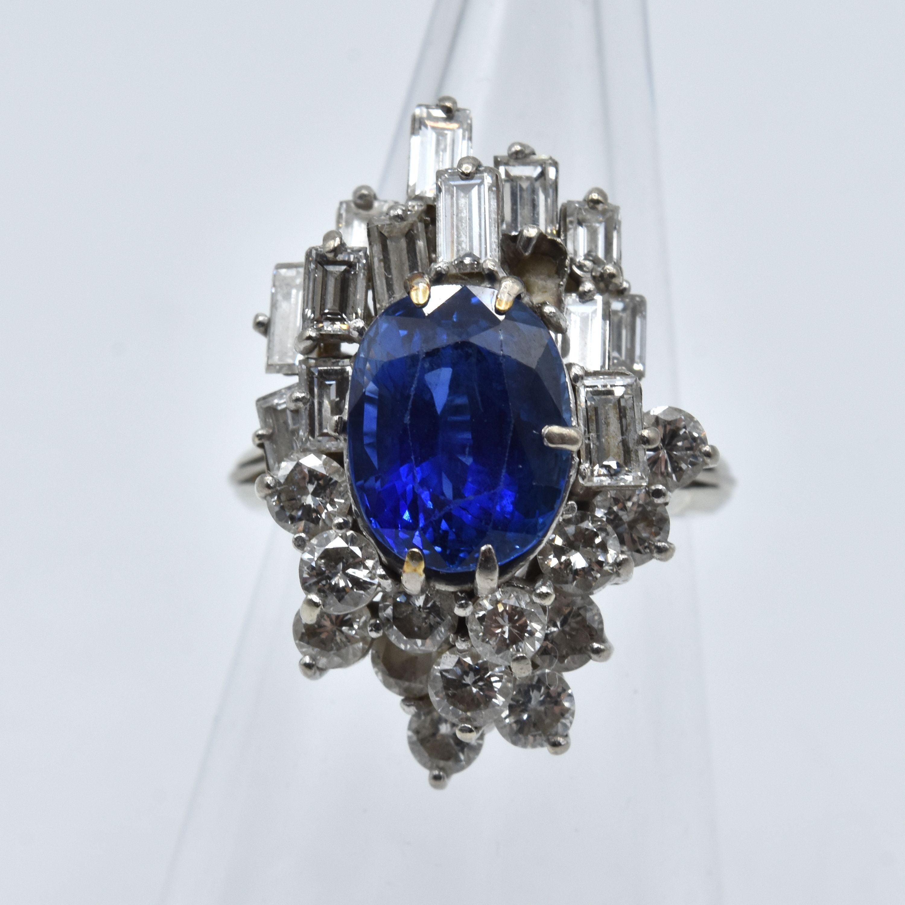 Bague en or blanc 14 ct et 18 ct sertie de 13 brillants +/- 1.30 ct, 12 diamants taille baguette +/- 1 ct et 1 saphir doublet (pierre manque, griffée, abîmée, bosselée) - 12.2 g brut (Taille: 61)