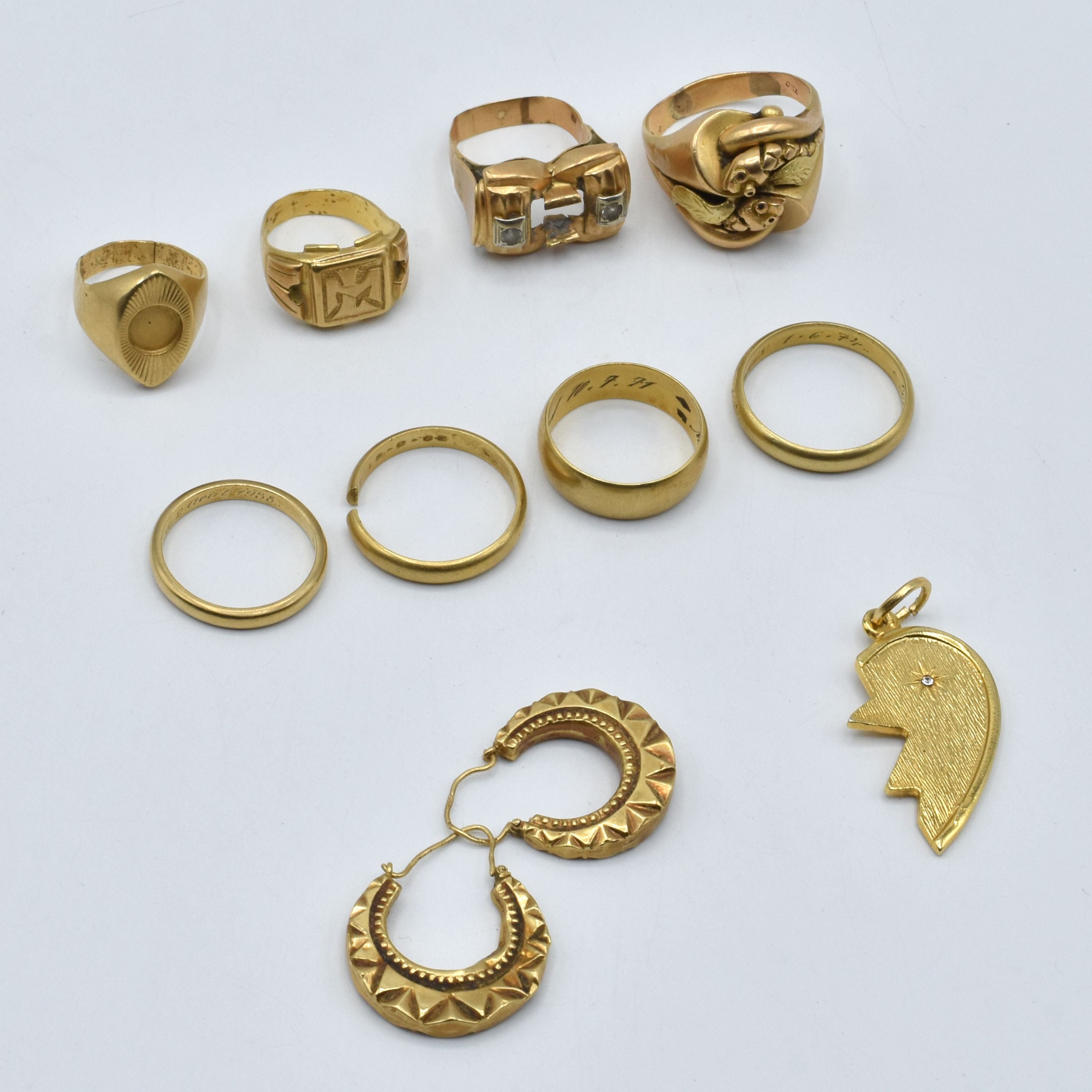 4 alliances, 2 chevalières, 2 bagues et 2 boucles d'oreilles or 3 couleurs 18 ct (pierres fausses, pierres manquent, gravées, personnalisée, morceau manque, abîmées, bosselées, cassée) - 57 g brut (Tailles: +/- 64, 63.5, 60, 58.5, 57 x 2 & 50 x 2) Pendentif en plaqué or (pierre fausse, abîmé)