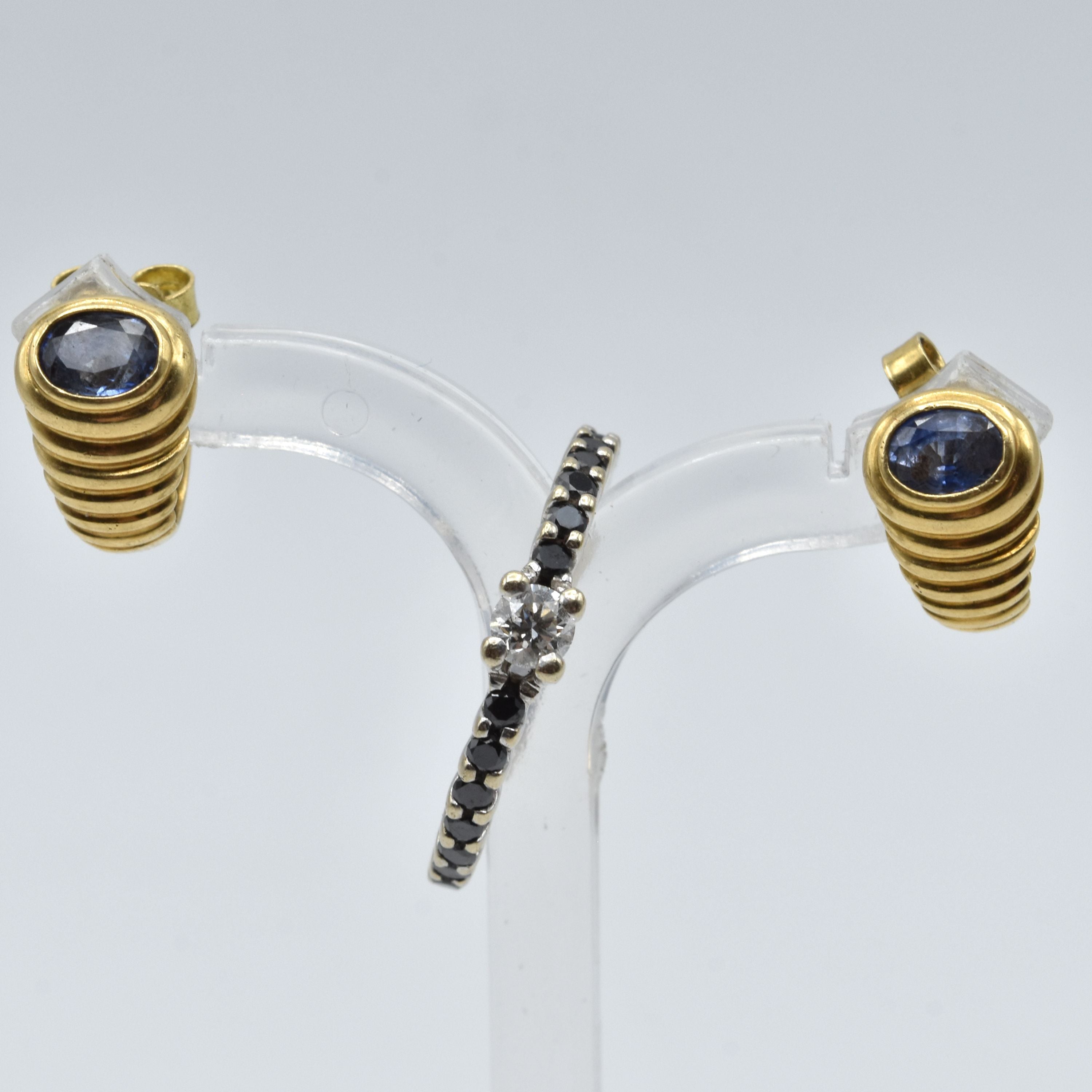 Bague et 2 boucles d'oreilles en or jaune et blanc 18 ct sertie d'1 brillant +/- 0.18 ct et diamants noirs (pierres de couleur, pierres manquent, abîmées) - 6.7 g (Taille: 51)