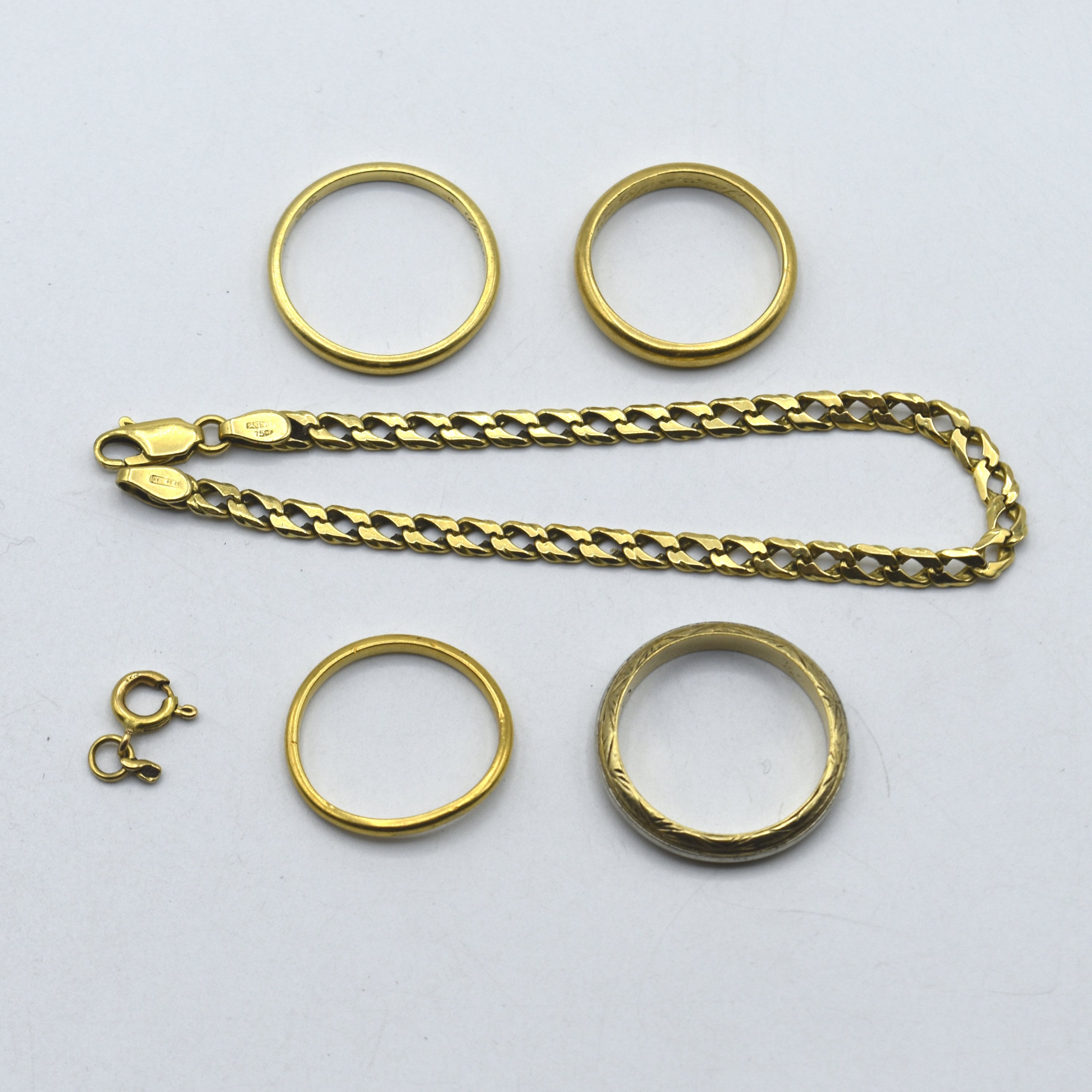 4 alliances, bracelet et fermoir en or jaune et blanc 18 ct (gravées, bosselés) - 20.8 g (Tailles: 53, 56 & 2 x 60) (17.5 cm)