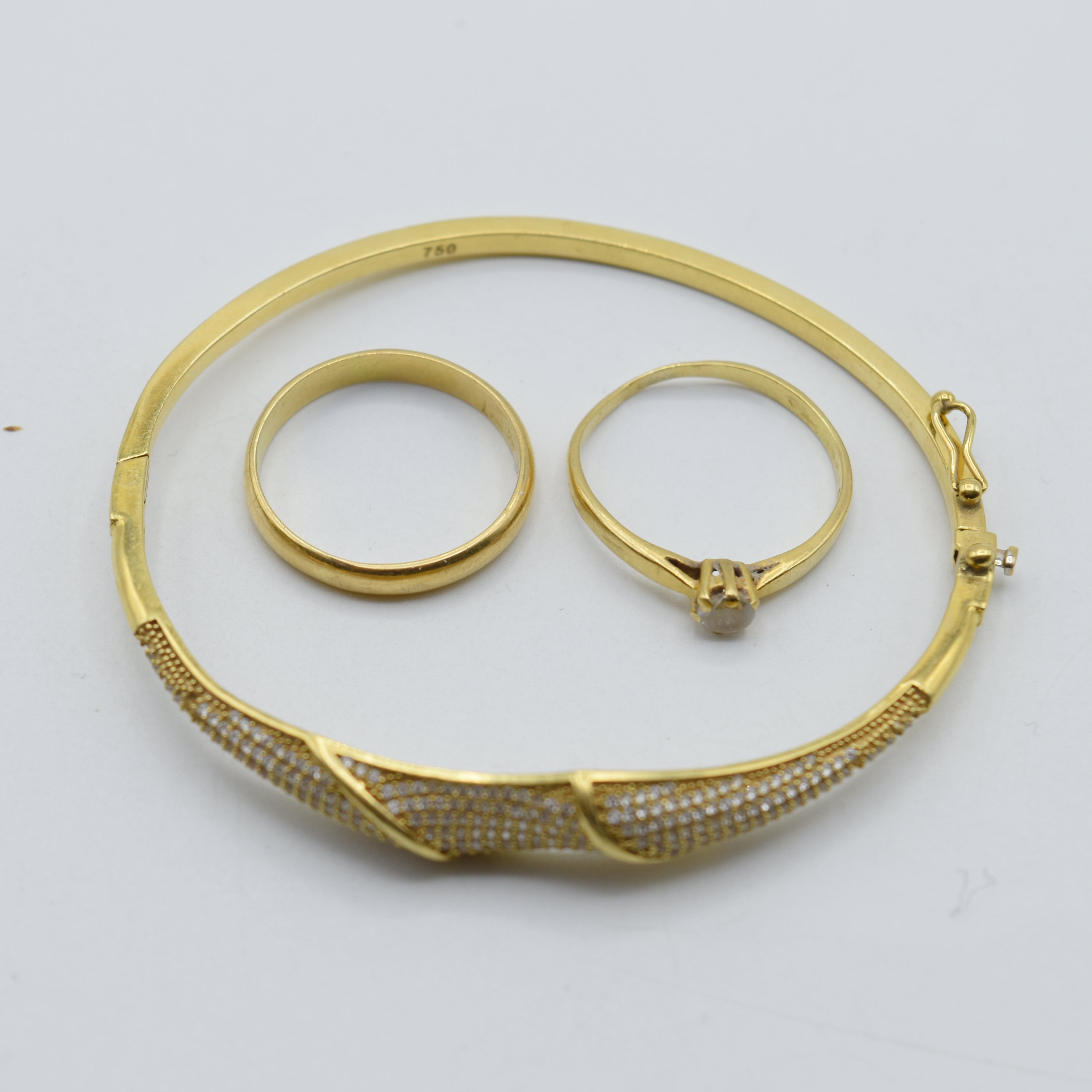 Alliance, bague et bracelet rigide en or jaune 18 ct (pierres fausses, pierres manquent, bosselés) - 13.4 g (Tailles: 57 & 58)