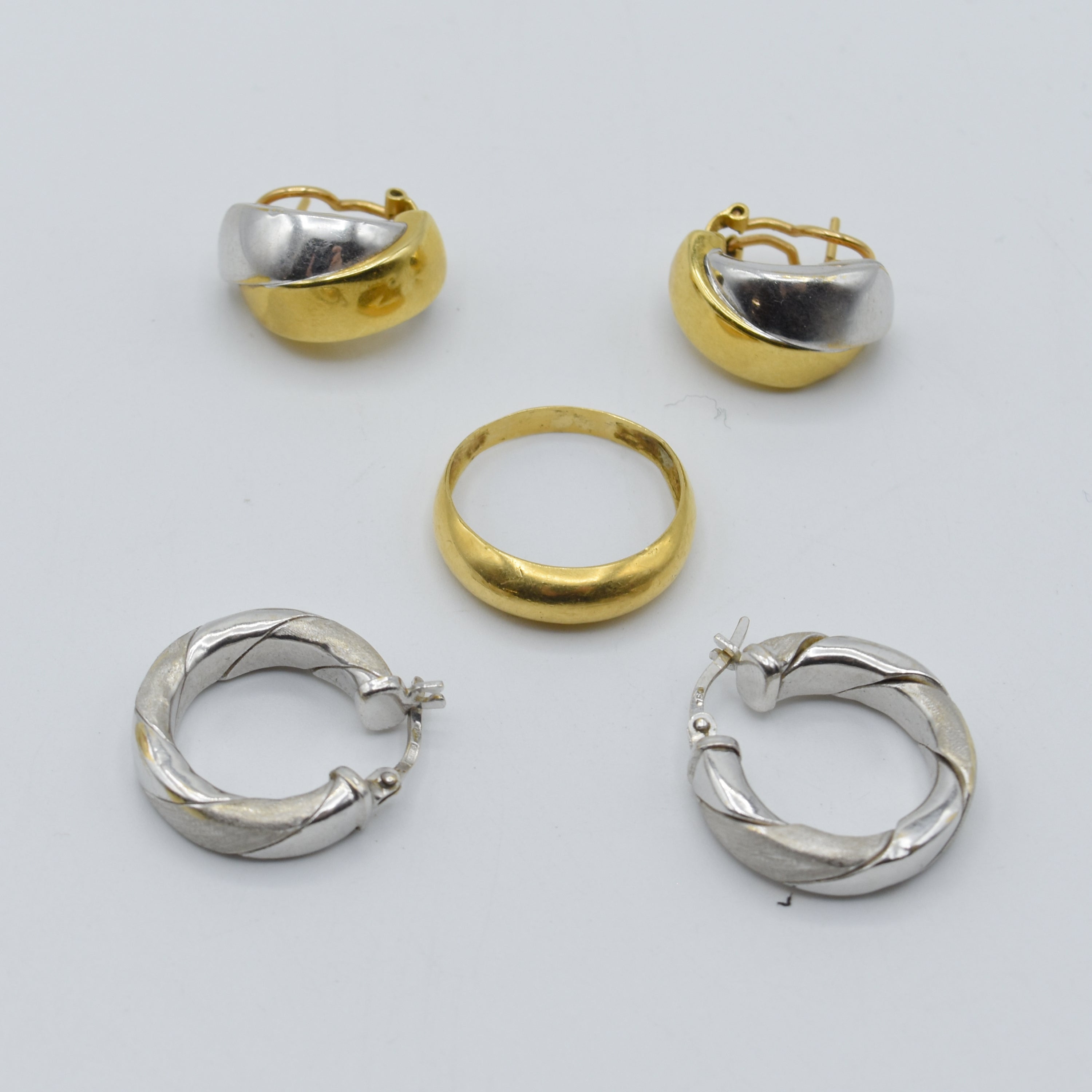 Bague et 4 boucles d'oreilles en or jaune et blanc 18 ct (bosselées) - 11.3 g (Taille: 59)