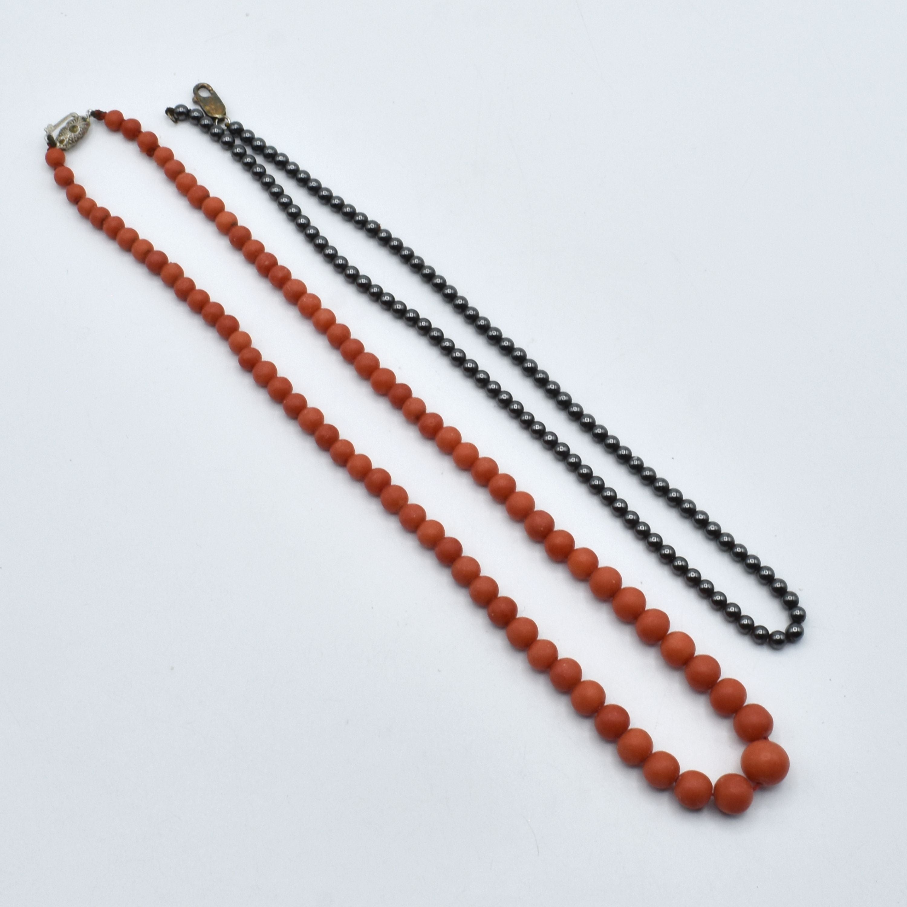 Collier de coraux en chute (5 à 10 mm) avec fermoir en argent 835/1000 (abîmé) (50 cm) Collier d'hématites (+/- 4 mm) avec fermoir en argent 925/1000 (fermoir oxydé) (42.5 cm)