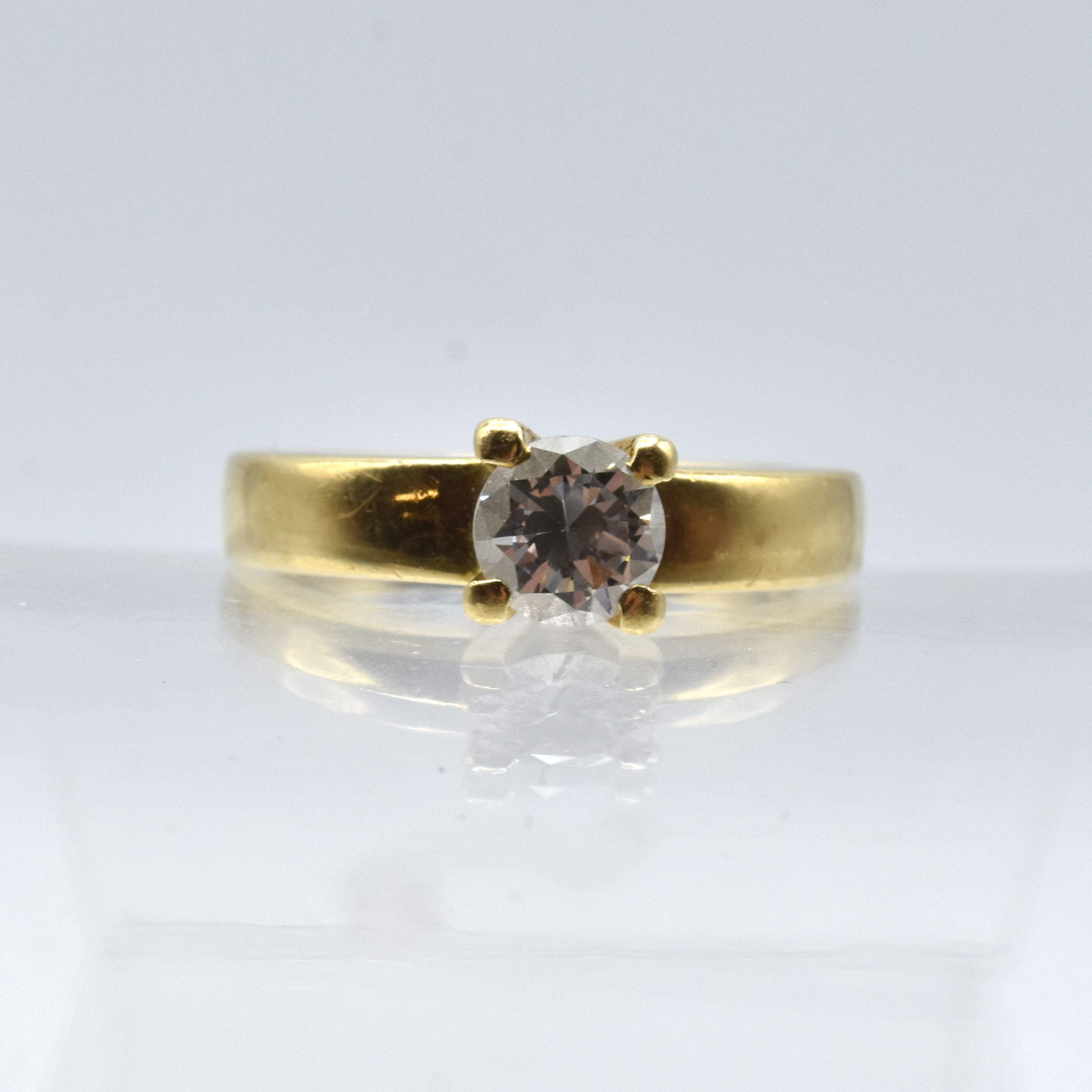 Bague en or jaune 18 ct sertie d'1 brillant +/- 0.60 ct (bosselée) - 5.6 g (Taille: 52) + certificat bijoutier