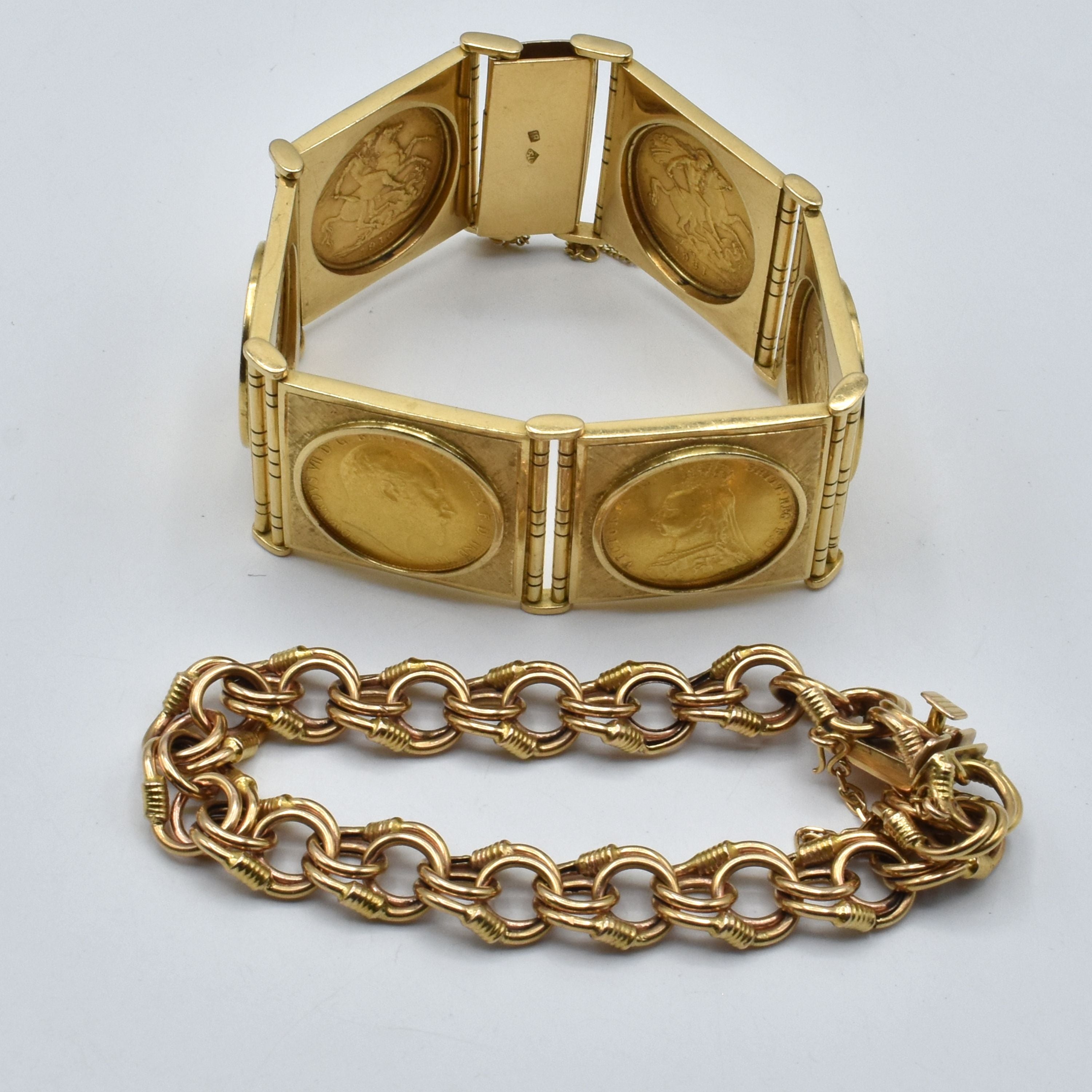 2 bracelets en or jaune et rose 18 ct sertie de 6 pièces de monnaie en or jaune 916/1000 (anglaises-1x Souverain Victoria-1888, 3x 1/2 Souverain Edwardus VII-1904 & 1910 x 2, 2x Souverain Georgius-1931-1912) - 135.1 g brut (19.5 cm x 2)