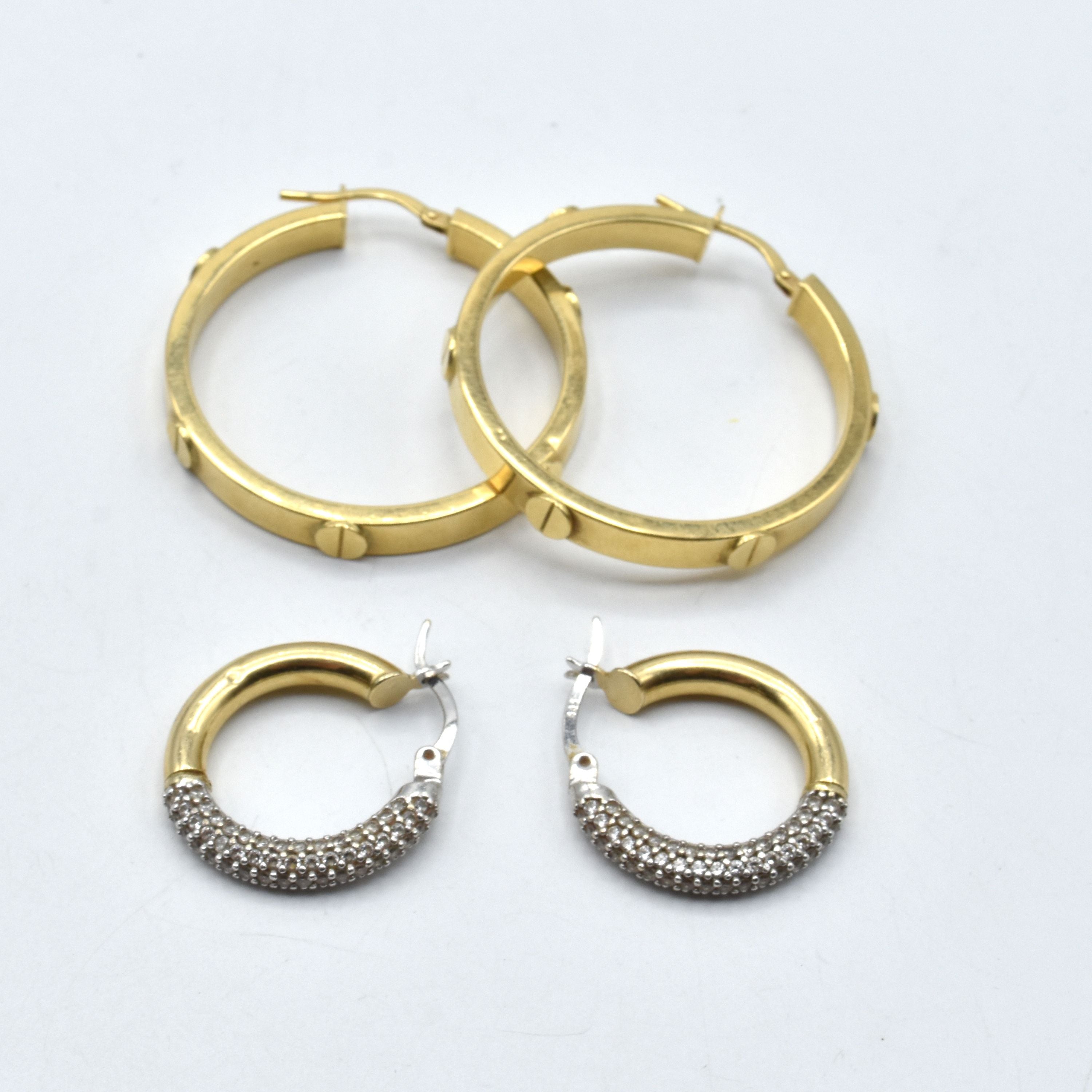 2 boucles d'oreilles en or jaune 18 ct (très légèrement bosselées) - 4.6 g 2 boucles d'oreilles en or jaune et blanc 14 ct (pierres fausses, bosselées) - 4.4 g brut