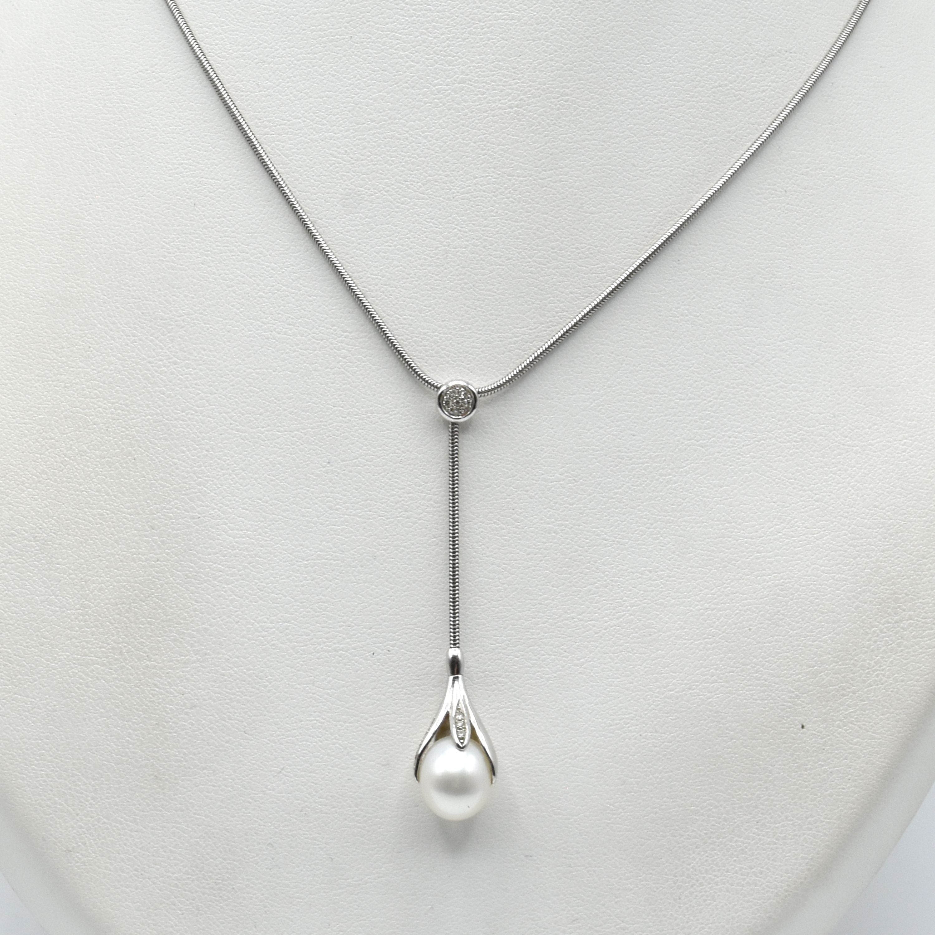 Collier avec pendentif attaché en or blanc 18 ct serti de 13 brillants +/- 0.10 ct et 1 perle (2 anneaux en métal) - 7.6 g brut (41 cm)
