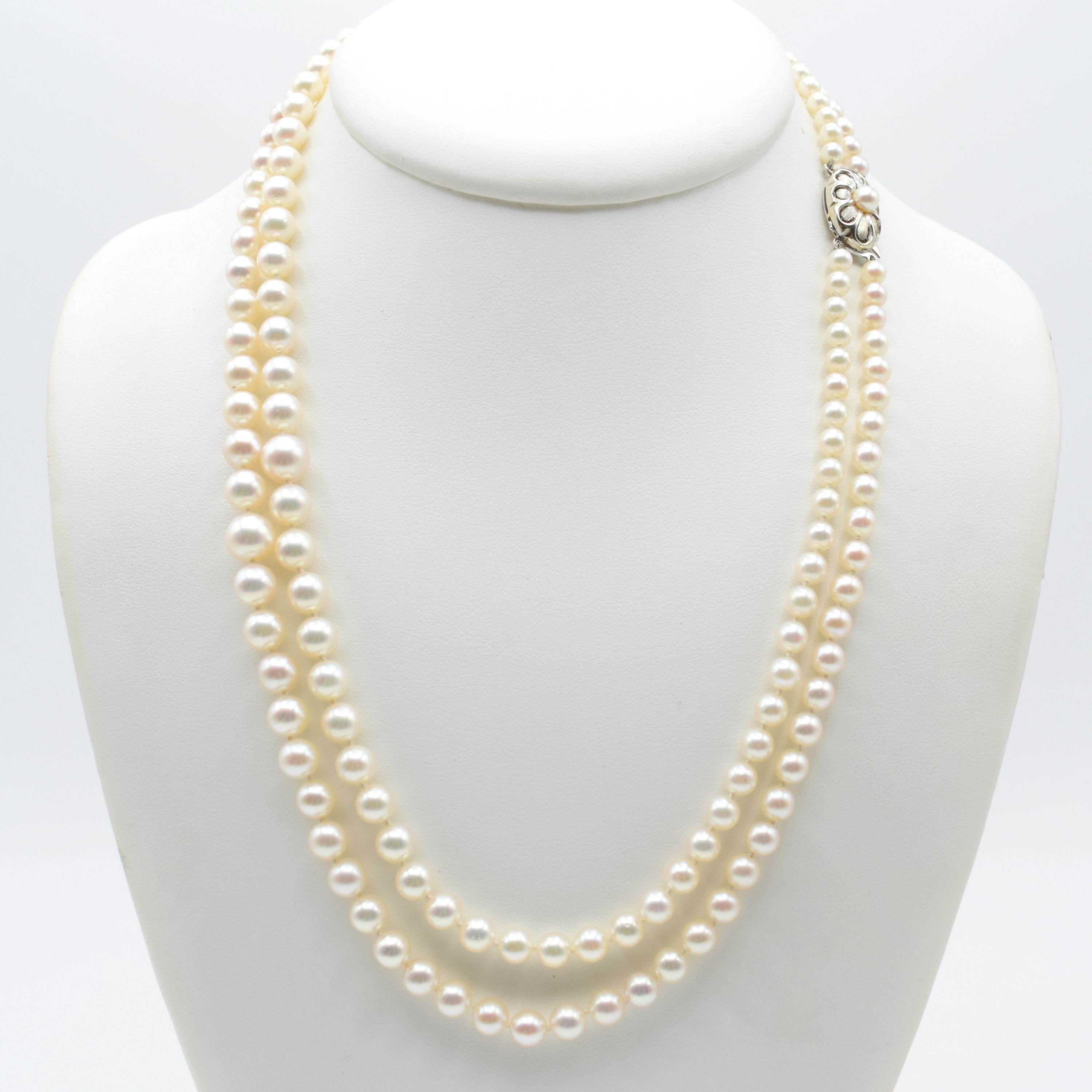 Collier de perles Akoya à deux rangs en chute avec fermoir en or blanc 18 ct serti d'1 perle (48.5 cm)