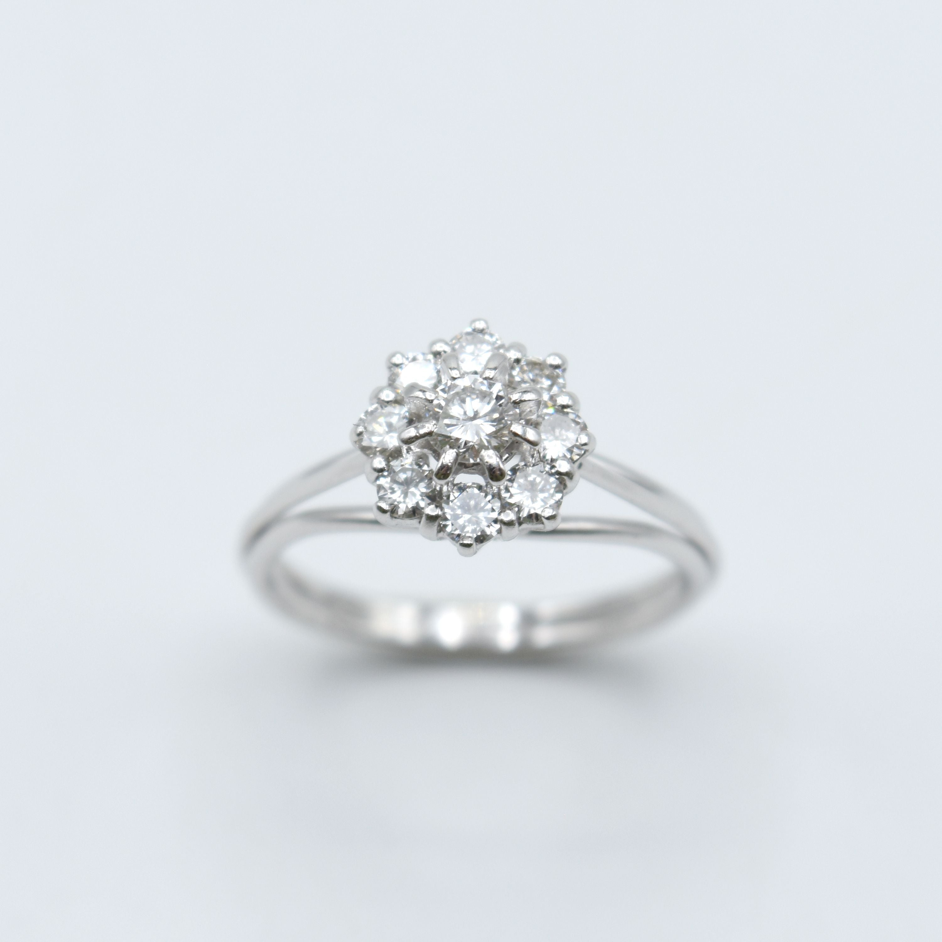 Bague en or blanc 18 ct sertie d'1 brillant central +/- 0.20 ct et 8 brillants +/- 0.40 ct - 3.5 g (Taille: 55)