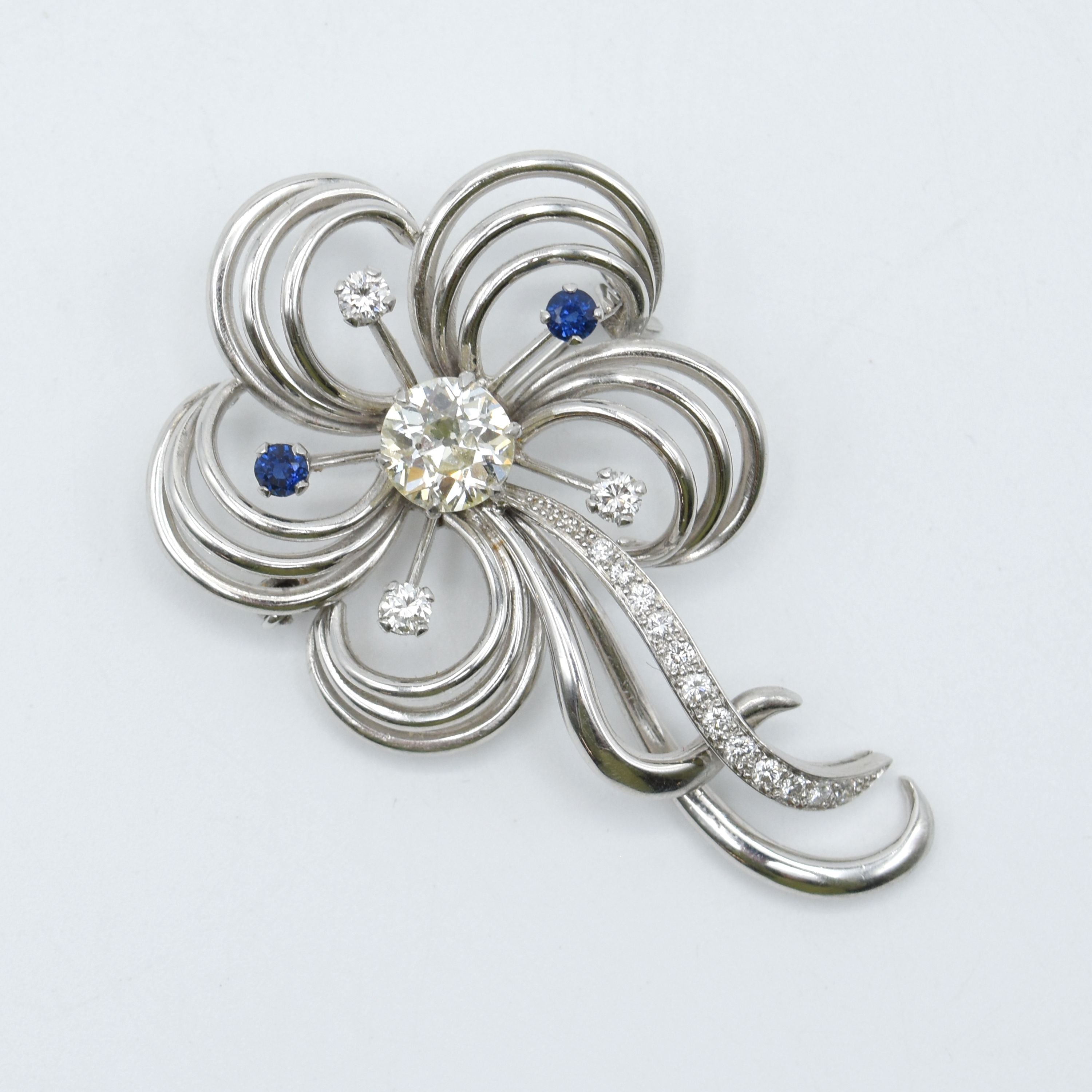 Broche en or blanc 18 ct sertie d'1 diamant taille ancienne +/- 1.30 ct et 15 brillants +/- 0.45 ct (pierres de couleur) - 16.8 g brut