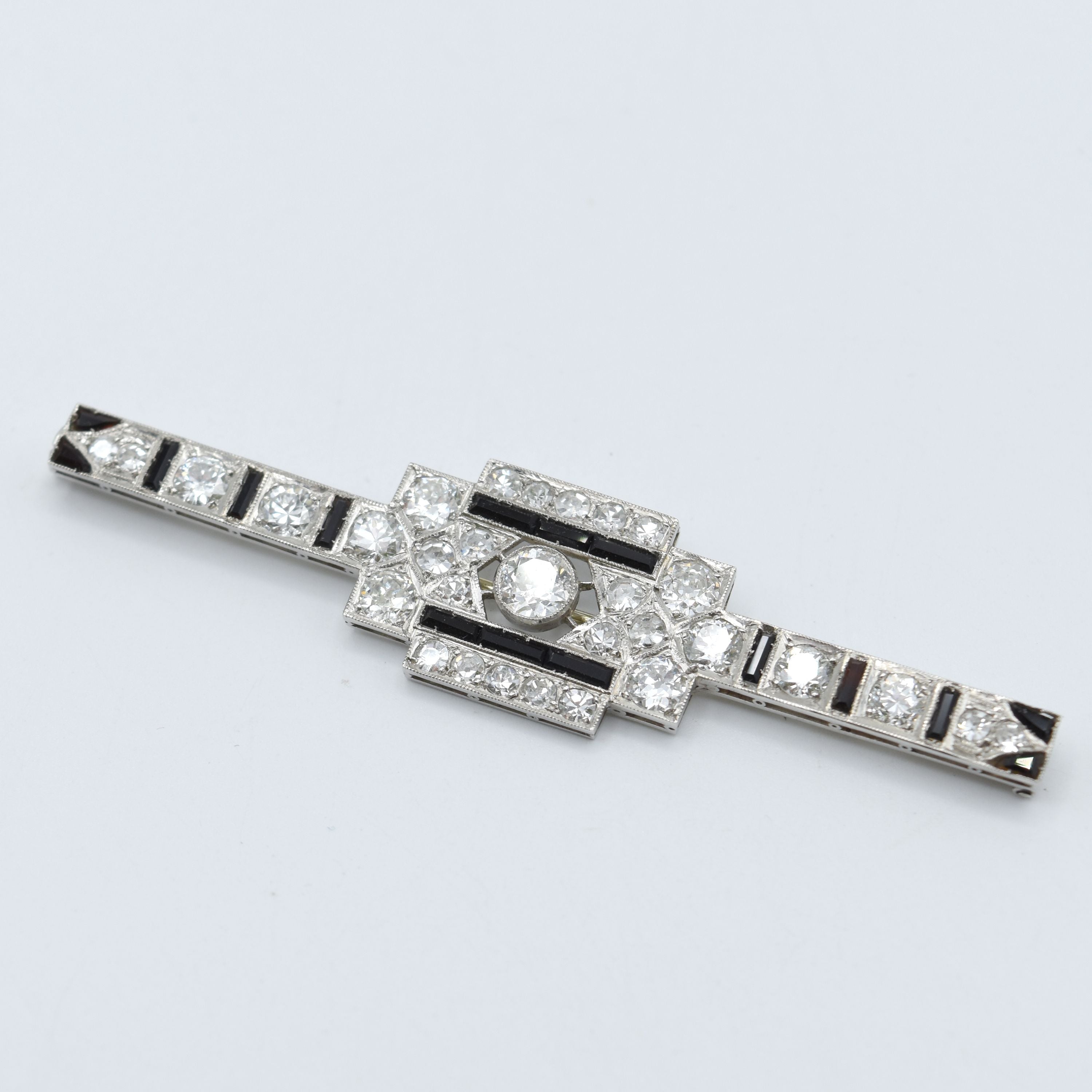 Broche en platine avec épingle en or blanc 18 ct sertie d'1 diamant central taille ancienne +/- 0.50 ct et 30 diamants mélange de tailles +/- 2.80 ct (pierres de couleur) - 9.4 g + boîte