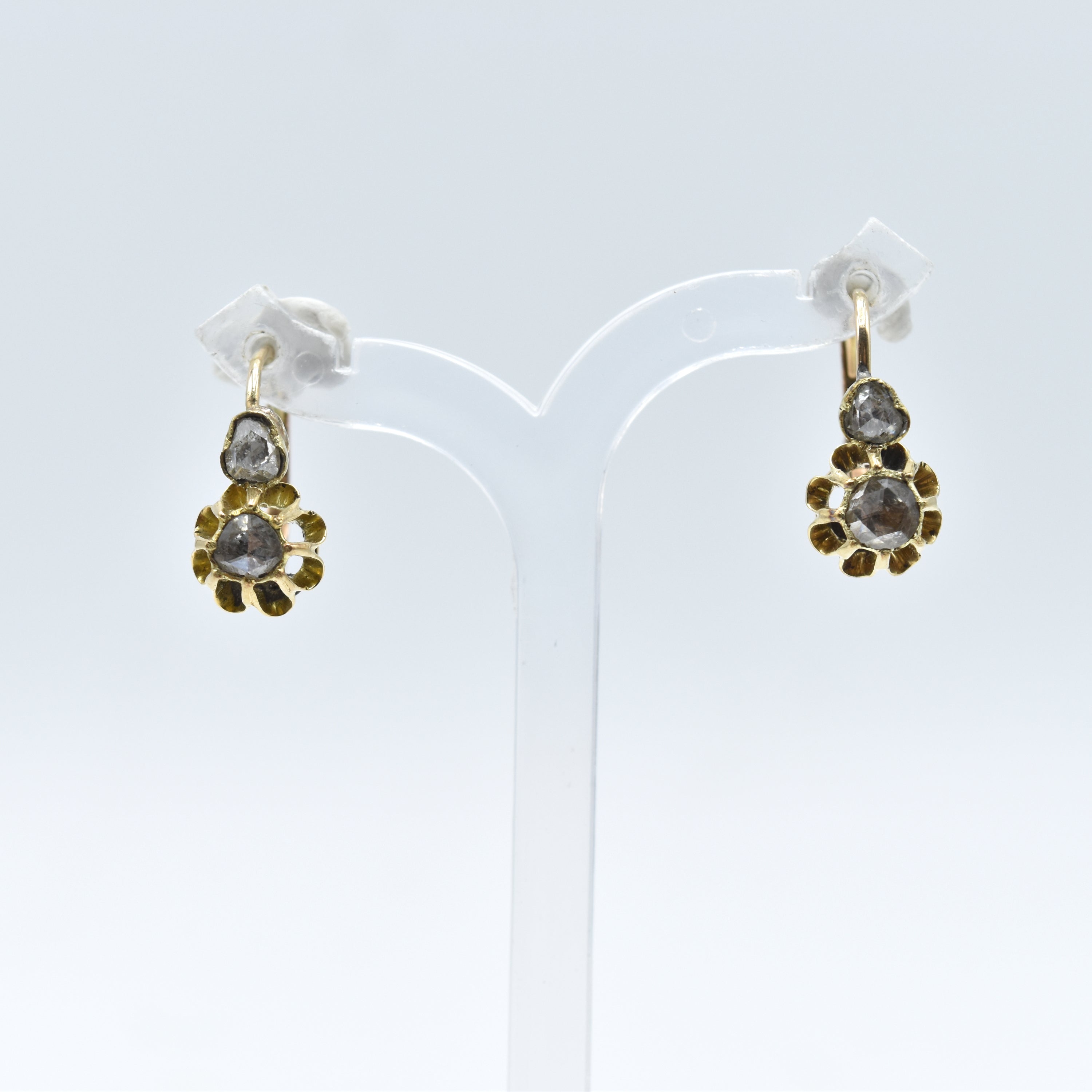 2 boucles d'oreilles anciennes en or jaune 18 ct serties de roses de diamants (étain) - 3.2 g brut + écrin