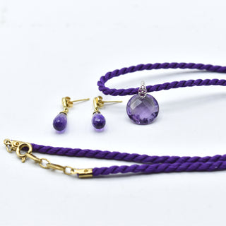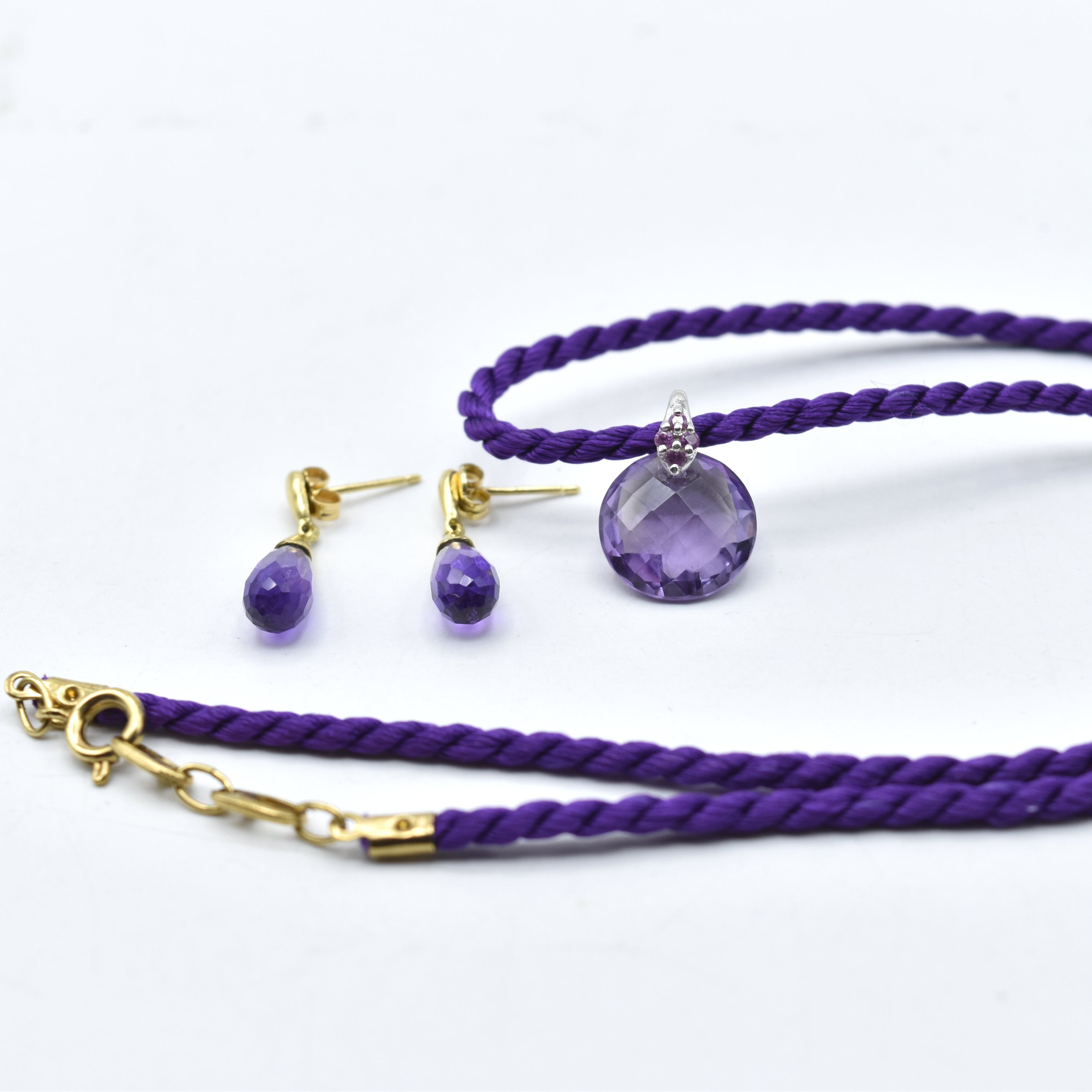 Pendentif et 2 boucles d'oreilles en or jaune et blanc 18 ct sertis d'améthystes - 2.8 g brut Collier en tissu avec fermoir en plaqué or (42 cm)