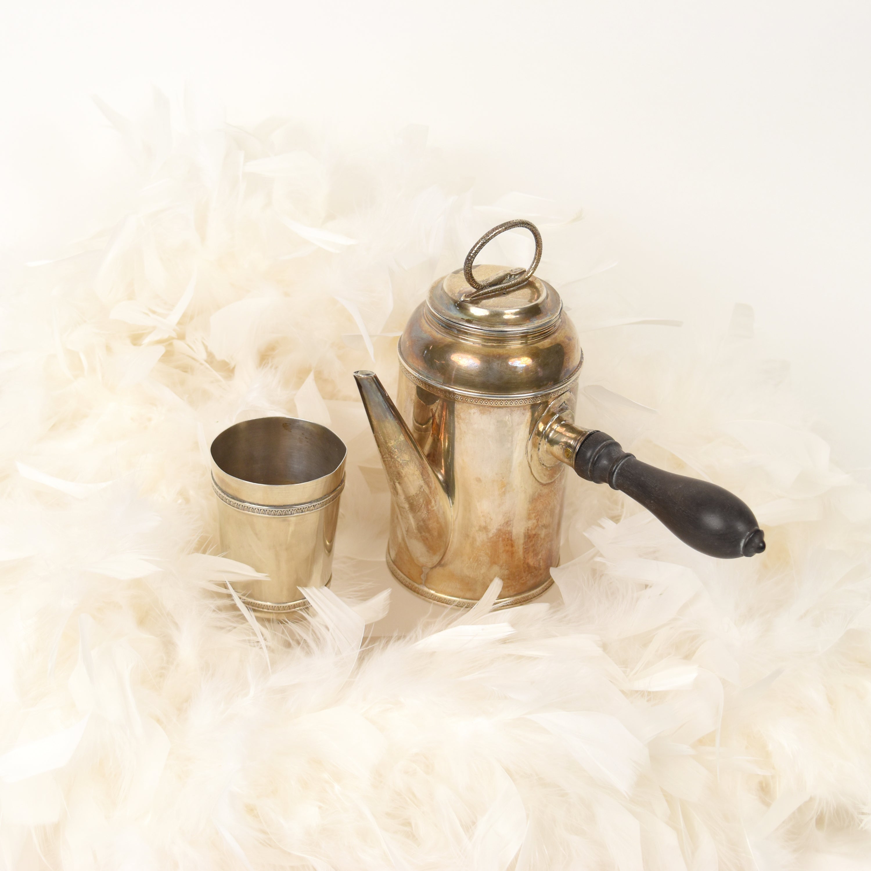 Chocolatière en argent poinçonnée (manche en bois, abîmée, bosselée) - 286.2 g brut (H: 16 cm) Gobelet en argent 800/1000(bosselé) - 62.2 g (H: 7 cm)