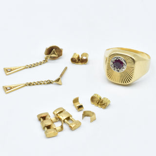 Bague, 2 boucles d'oreilles, poussette et 4 morceaux en or jaune 18 ct (pierres fausses, pierre de couleur, cassés) - 7.5 g (Taille: 50.5)