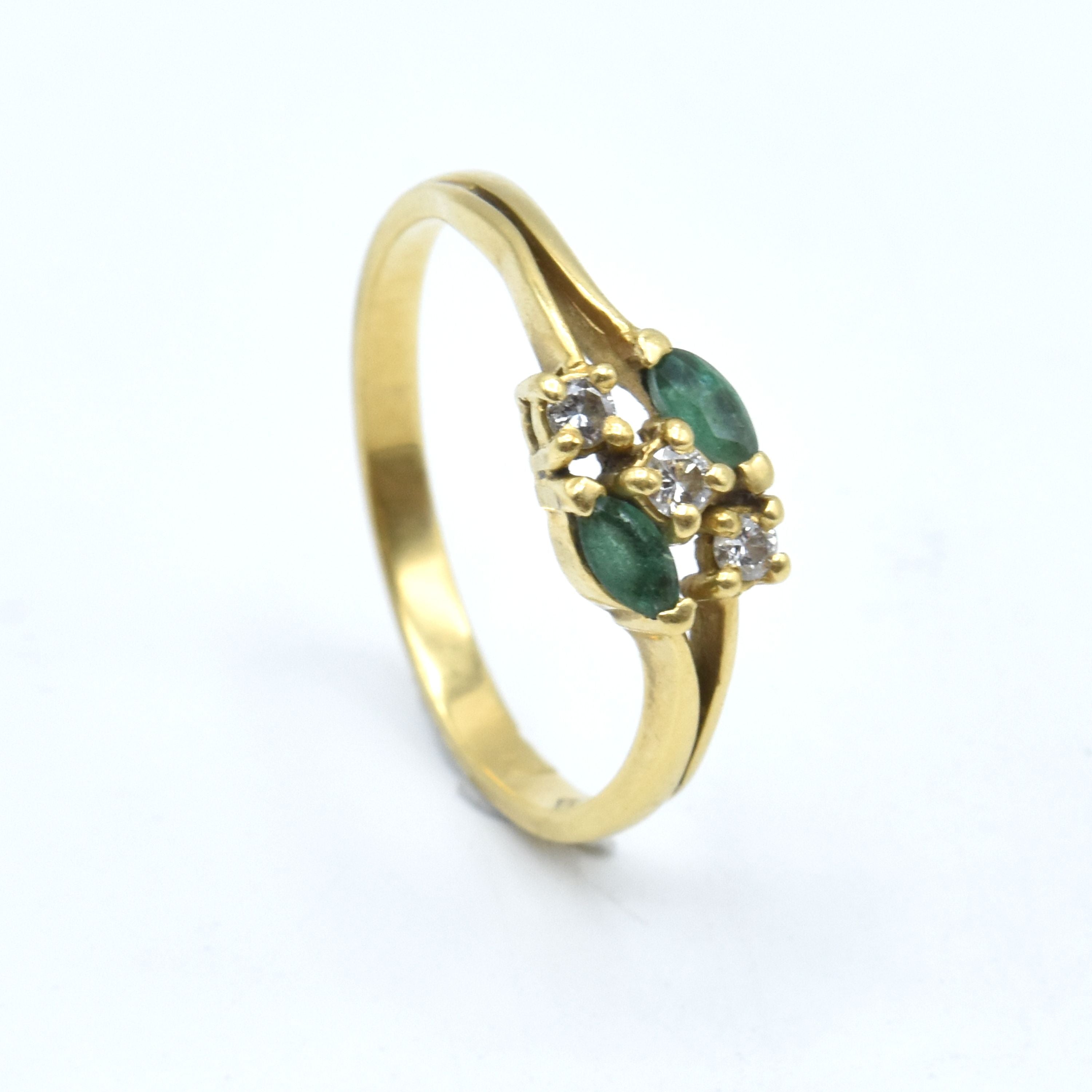 Bague en or jaune 18 ct sertie de 3 brillants +/- 0.09 ct et 2 émeraudes - 2.3 g brut (Taille: 53)