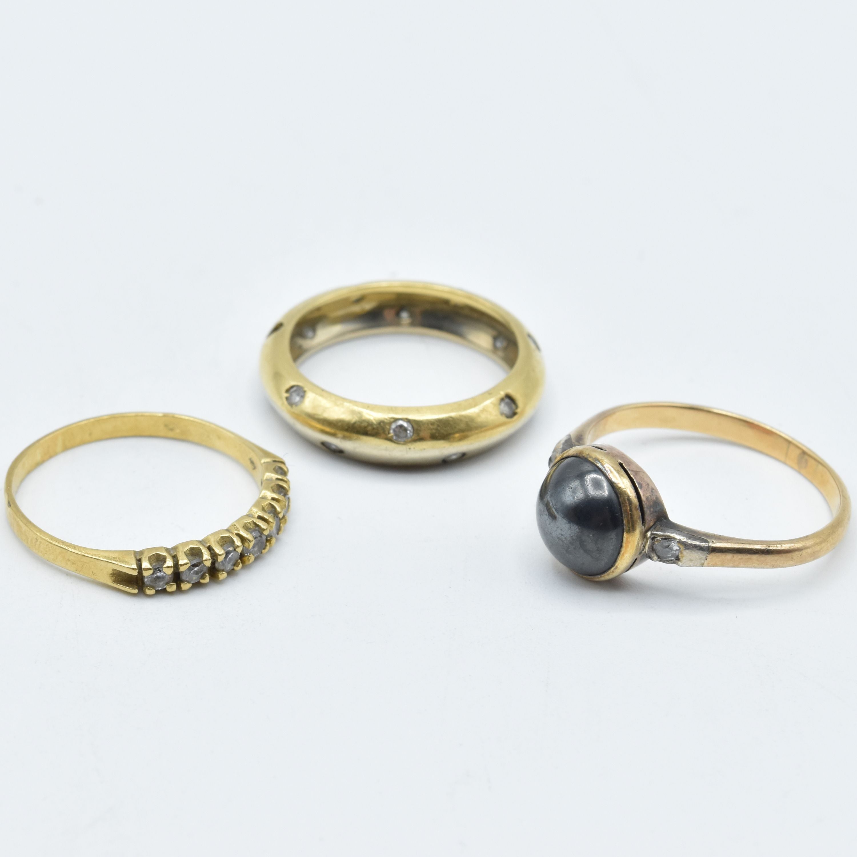 3 bagues en or jaune et blanc 18 ct sertie de 2 diamants taille ancienne +/- 0.04 ct (pierres fausses, pierre de couleur, bosselées) - 9.6 g brut (Tailles: 53, 54 & 56)