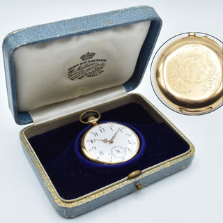 Montre de poche en or jaune 18 ct à 2 cuvettes dont 1 en métal mécanique (monogrammée, très légèrement bosselée) - 72.5 g brut + écrin d'origine