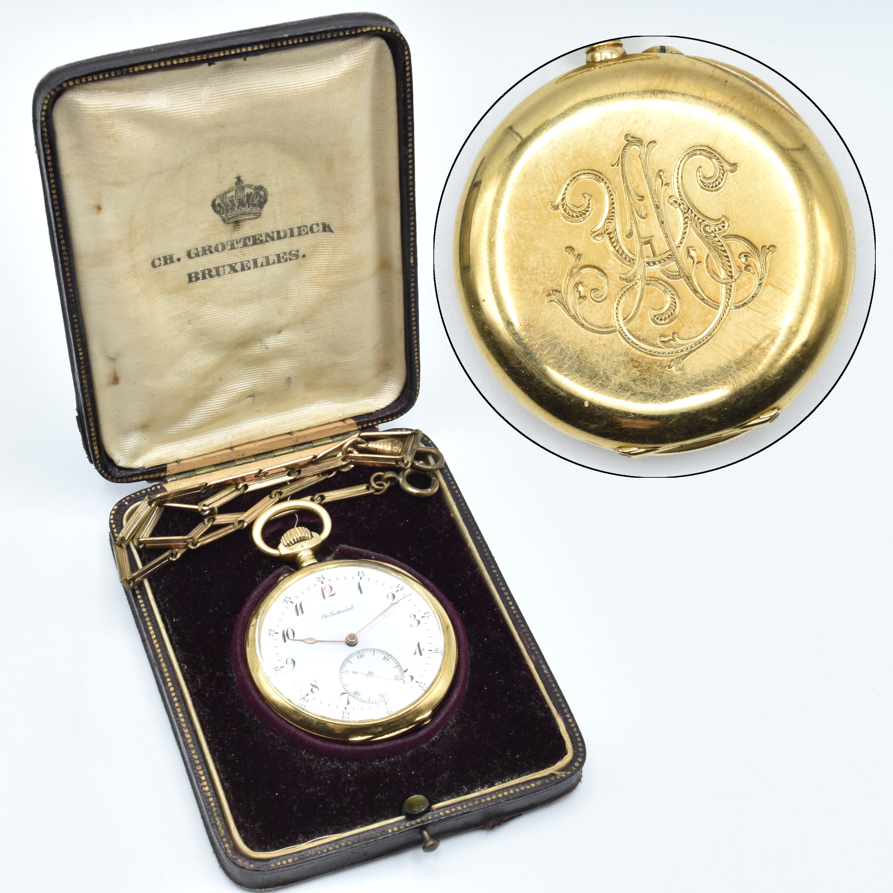 Montre de poche en or jaune 18 ct à 2 cuvettes Charles GROTTENDIECK mécanique (monogrammée, verre détaché, aiguille légèrement bosselée, montre légèrement bosselée) - 66.9 g brut + chaîne de montre en plaqué or + écrin d'origine