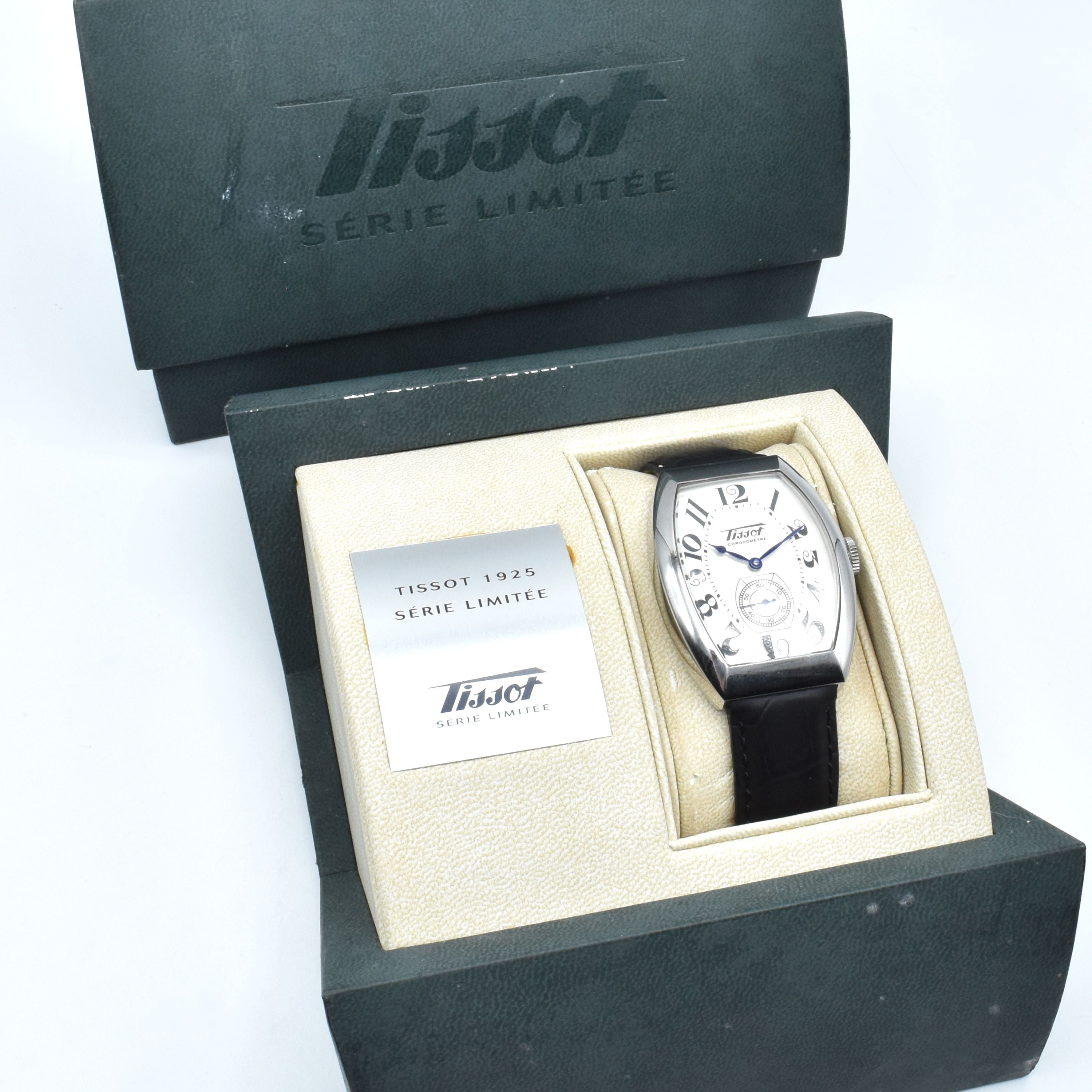 Bracelet-montre homme en acier TISSOT 1925 mécanique (série limitée, montre n° 1418/1925, bracelet en cuir avec boucle déployante) + boîte d'origine (légèrement abîmée)