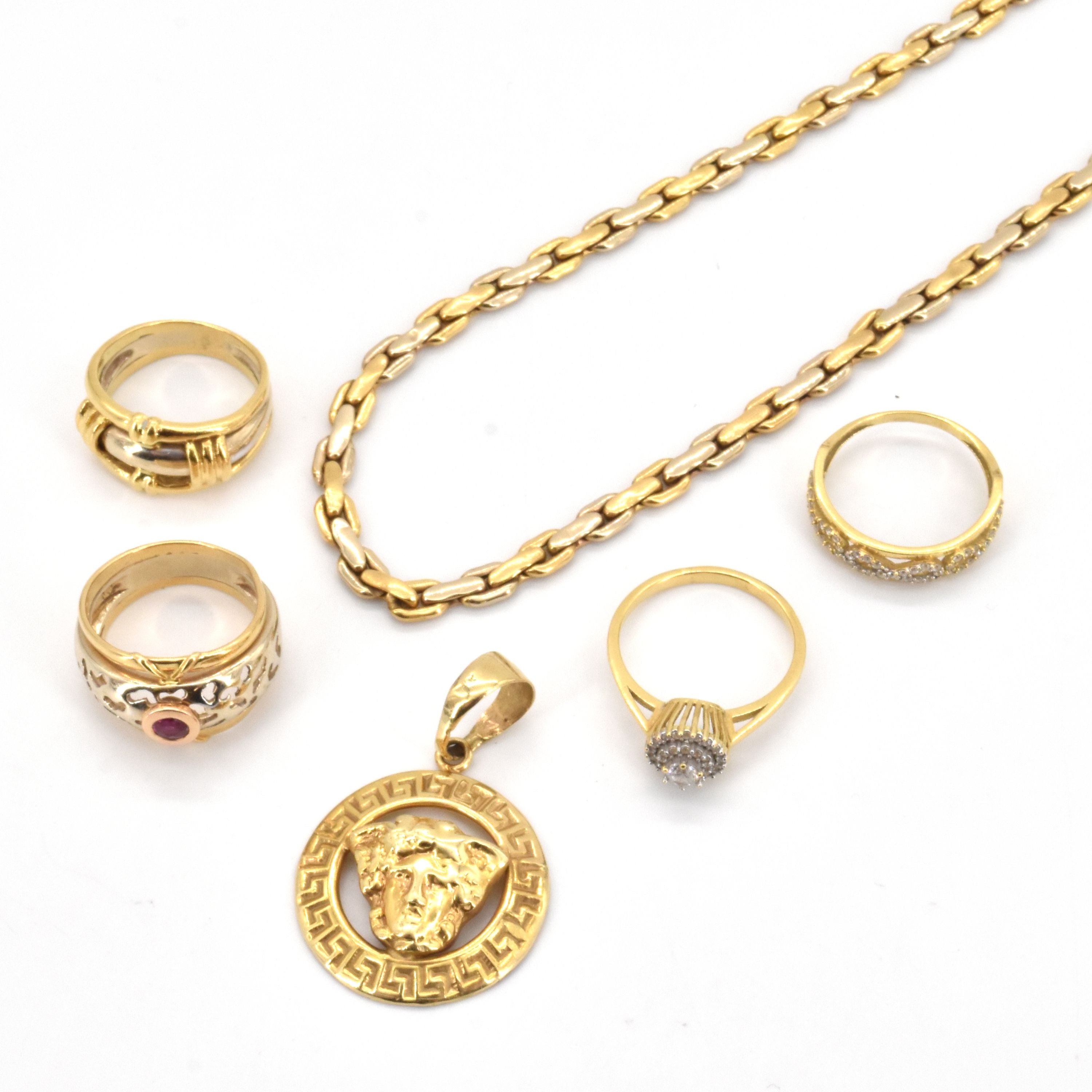 2 bagues, 2 colliers et pendentif en or jaune et blanc 18 ct - 36.4 g (Tailles: 57 & 61) (72 & 57.5 cm)