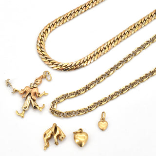 3 alliances, 3 chevalières, 2 bagues, collier et pendentif en or jaune et blanc 18 ct (roses de diamants, perle, camée, pierre fausse, pierre de couleur, pierre manque, personnalisées, gravée, étain, bosselés) - 64.7 g brut (Tailles: 55, 54, 52, 57, 59, 60 & 61 x 2) (42 cm)