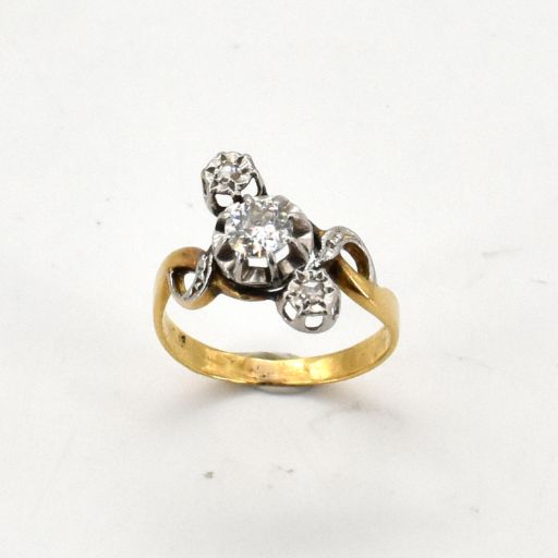 Bague en or jaune 18 ct avec parties en platine sertie d'1 diamant taille ancienne +/- 0.25 ct et 2 roses de diamant - 2.6 g (Taille: 50)